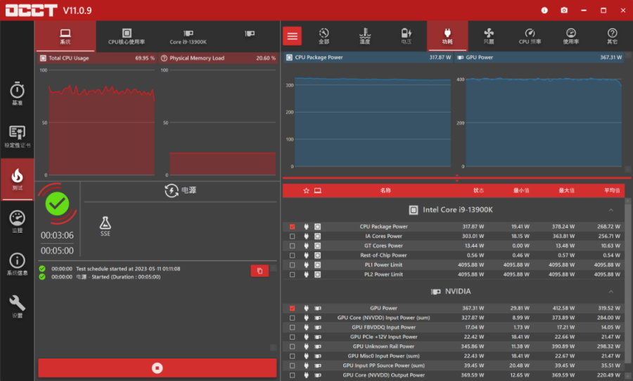 OCCT雙烤功耗測試,使用默認設置對CPU和顯卡進行雙烤測試,烤機5Min,在剛開始烤機時,CPU最大功耗達到了380W左右,烤機至一半時間之後,CPU功耗便穩定在了320W左右,而顯卡最大功耗則到了410W左右,之後便穩定在390W左右。烤機過程中,整機功耗基本維持在700W左右;