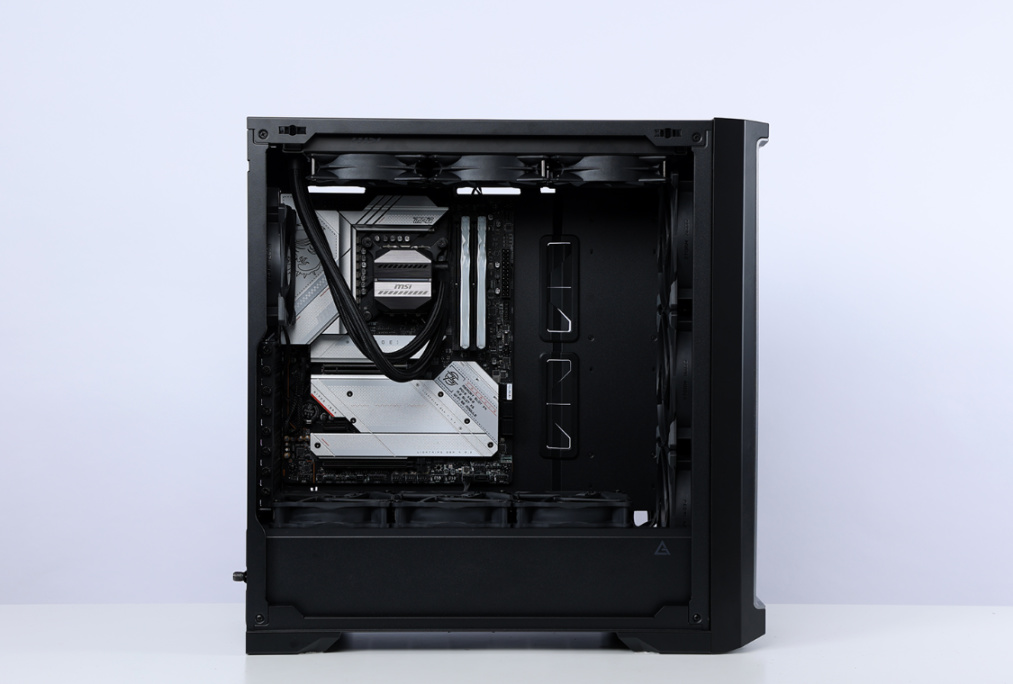 機箱內部空間充沛,全塔的規格也具備了更強大的硬件兼容性,最大可支持EATX規格主板安裝,顯卡限長也達到400mm。散熱方面,風冷限高175mm,支持前置安裝360/420規格的水冷,頂部也支持安裝360規格的水冷。機箱最多可同時安裝10把散熱風扇(含電源倉上方的3個風扇位)。