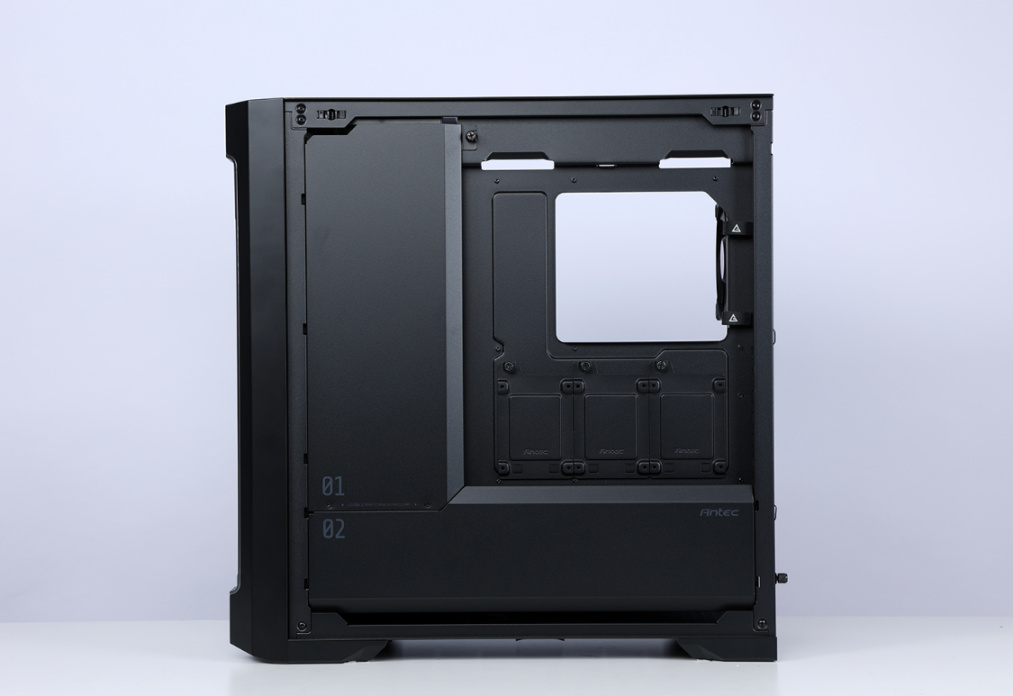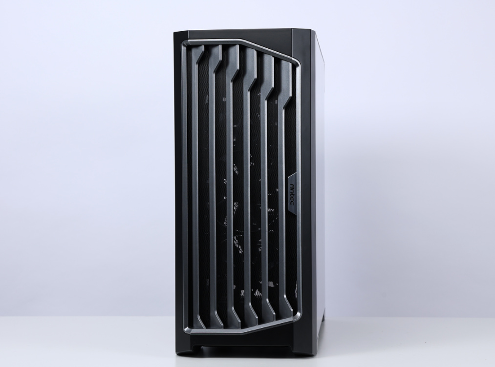 機箱前面板採用百葉窗型格柵式設計,有點像高檔轎車前臉設計。表面採用了磨砂工藝,搭配上銀灰色金屬噴漆漆,質感拉滿。格柵內金屬防塵網在保證機箱熱交換效率的同時,防塵能力也直接拉滿。中間位置還有一塊印有安鈦克(Antec)英文LOGO的鋁合金銘牌;