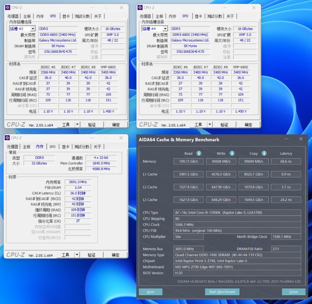 使用 Memory Try it,將內存OC至7400MHz後,內存讀取速度爲109.73 GB/s,寫入速度爲94508 MB/s,複製速度爲99694 MB/s,延時爲68.6 ns;