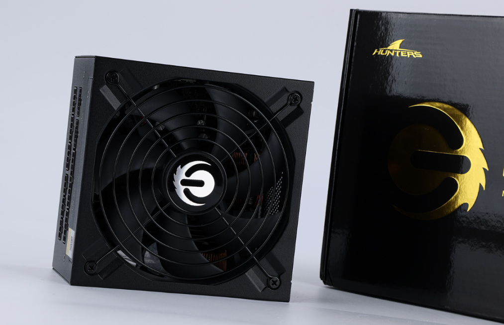 電源內部配備了一顆支持智能啓停的14CM大口徑風扇,而風扇防塵網的正中央還刻着HUNTERS獵金部落的LOGO。風扇採用了高轉速動態靜音軸承,在電源負載低於20% 的時候會自動停轉,避免電源與機箱之間產生的共振,以減小噪音的產生。搭配上電源側面的蜂窩狀開孔,可以在電源內部形成一條高效的“L”型散熱風道,大幅降低電源運行時產生的熱量;