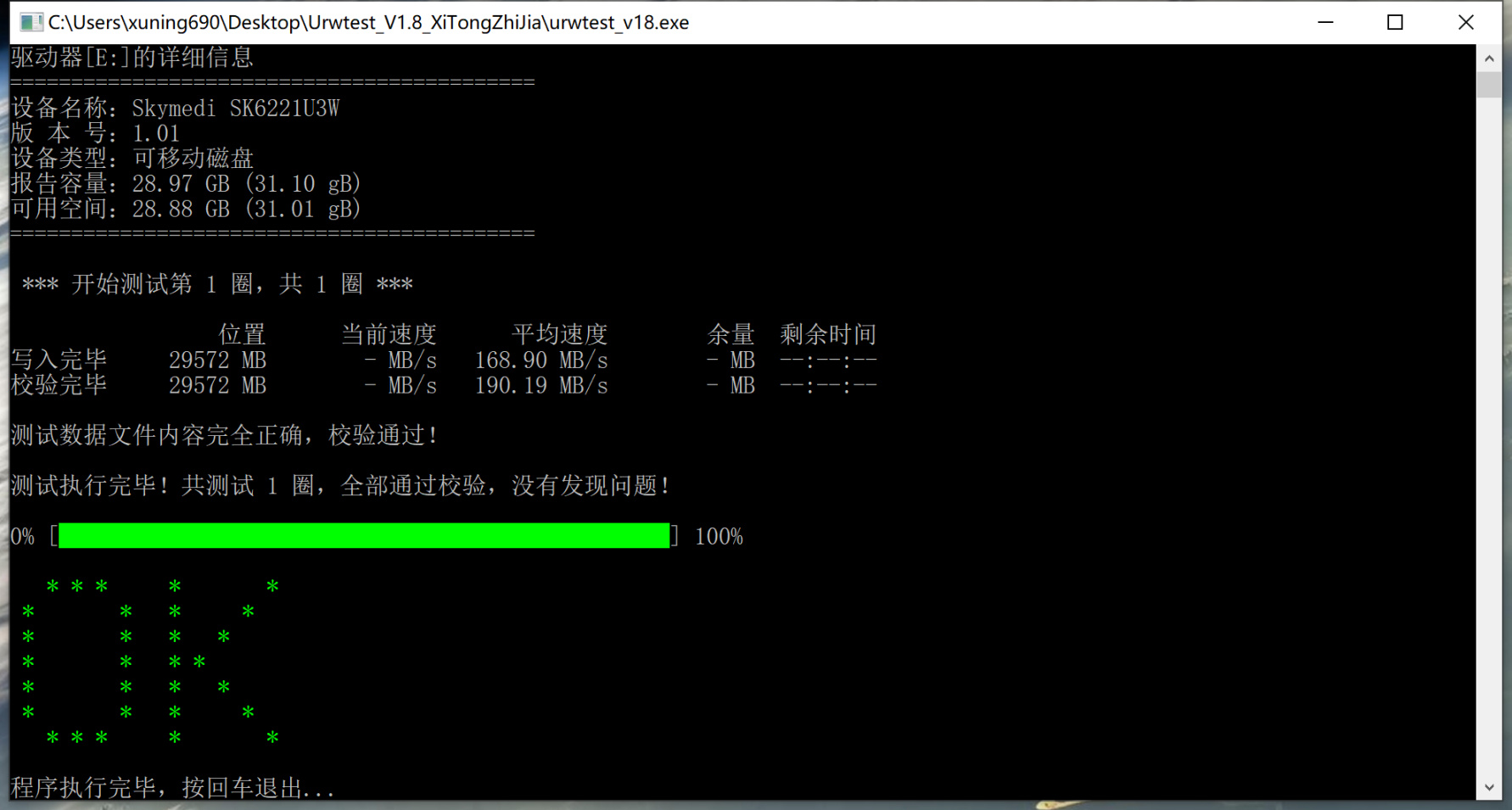 ▲urwtest是检测U盘是否扩容的一个小工具,同时也能测试出U盘的实时和平均读写速度。在urwtest的检测中,这块SLC U盘的全盘平均写入速度为168MB/s,读取速度为190MB/s。