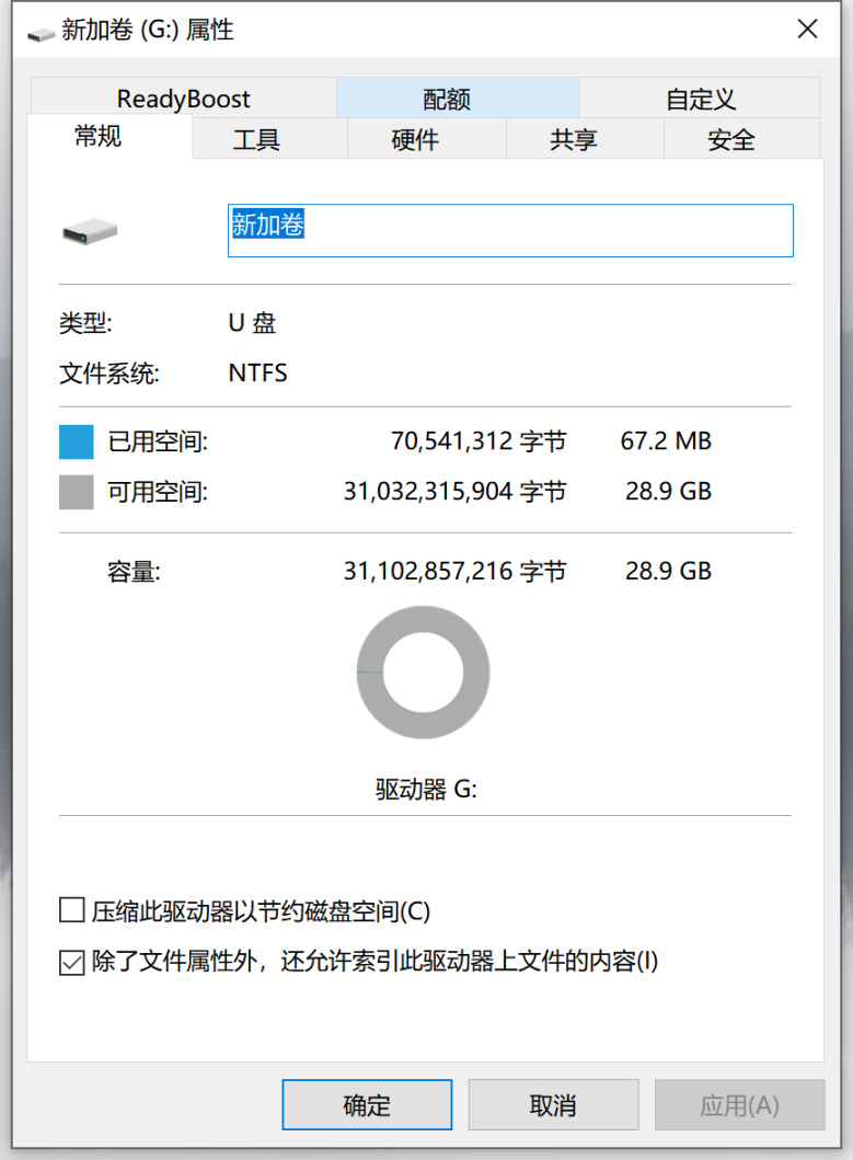 ▲容量标称32G,由于2进制和10进制的换算原因,实际插到电脑上时的可用空间只有28.9G。