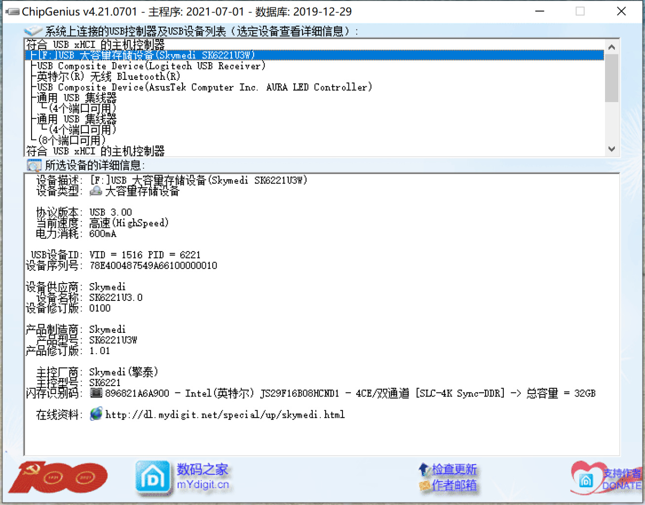▲首先使用ChipGenius可以识别出主控为SK6221.
