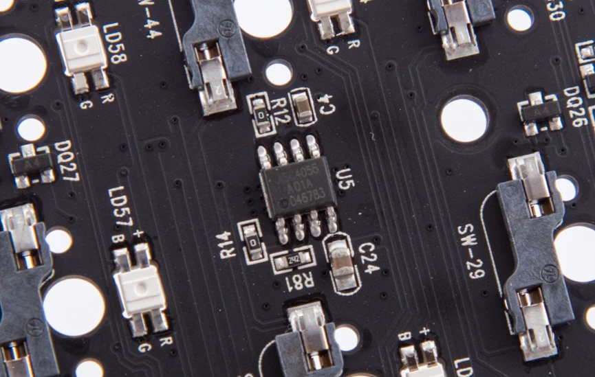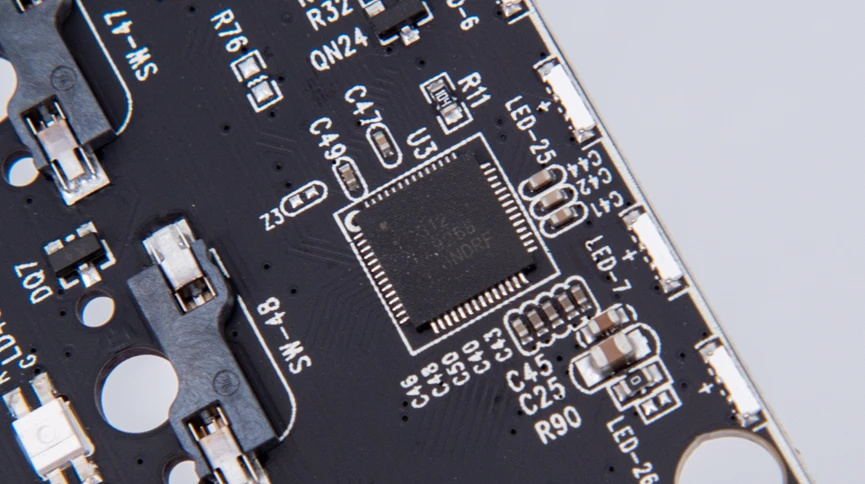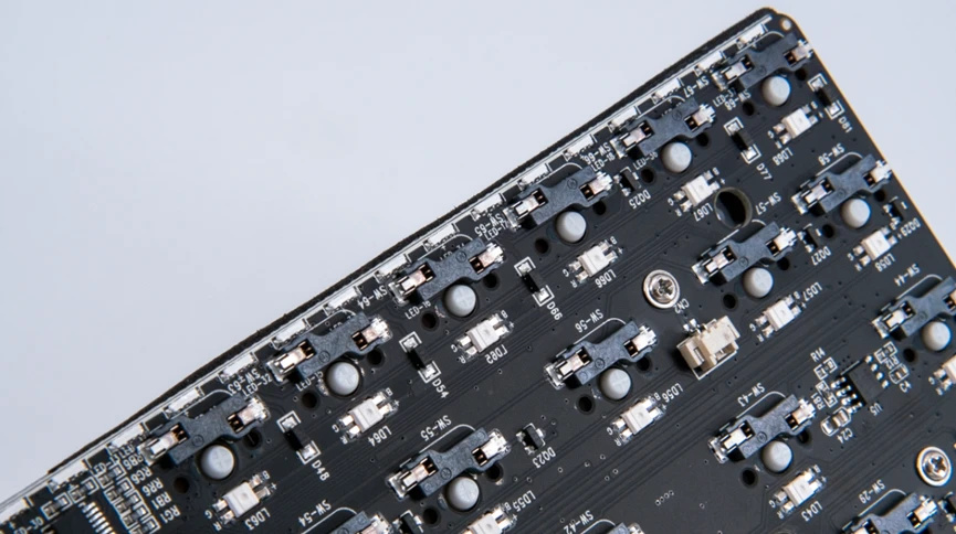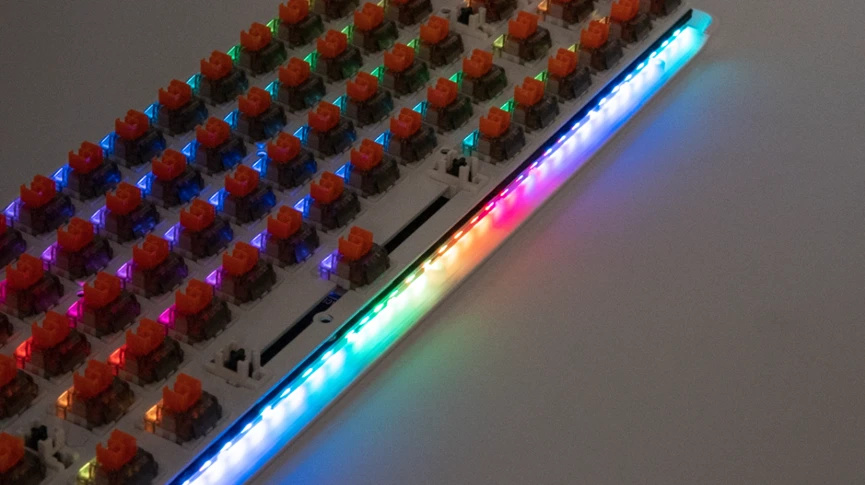 PCB下边有一整排的RGB灯珠,灯光效果和帧数都不错。但自带的导光条会让灯珠亮度折损很大,远不如拆掉后的效果。