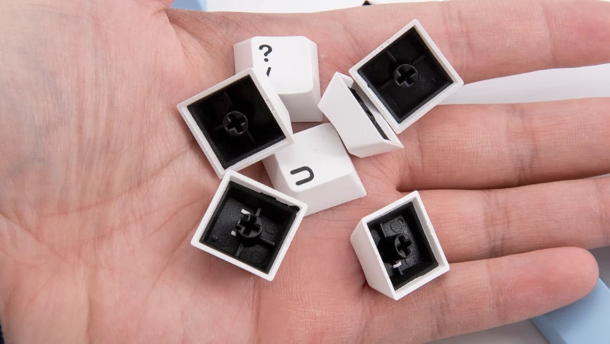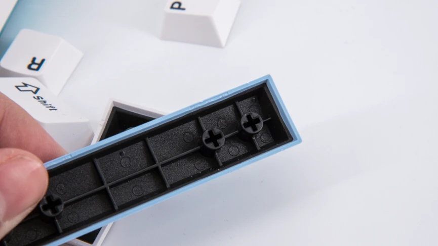 标配的是一套PBT二色注塑键帽,CSA高度,做工和细节处理都挺好,部分键帽底部会有一点毛刺。