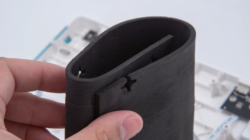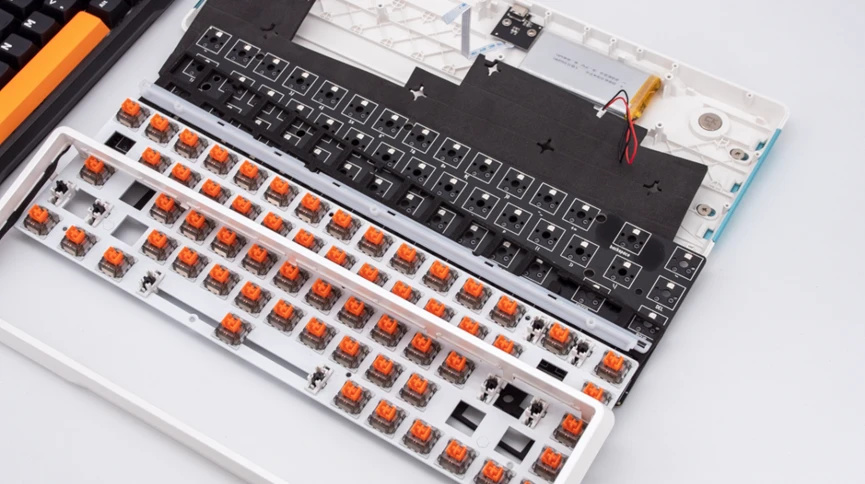 底棉和夹心垫厚度不错,材质都是偏硬的EVA。整把键盘的手感和声音表现并没有麻将音那种柔润的感觉,而是比较干脆。