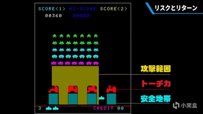 为了强化观众的印象,樱井用了日本游戏公司太东(TAITO)在1978年推出的街机游戏《太空侵略者》举例——在这款现在看来玩法相当简单的游戏中,我们需要一边操作太空船和外星侵略者们战斗,一边保护我方的太空堡垒和最终防线。因为是电子游戏历史上的“老古董”,玩家在《太空侵略者》中不需要多么复杂的操作量,只有左右移动和射击。