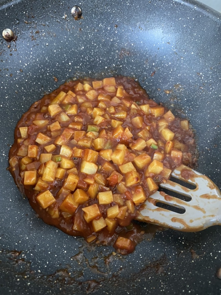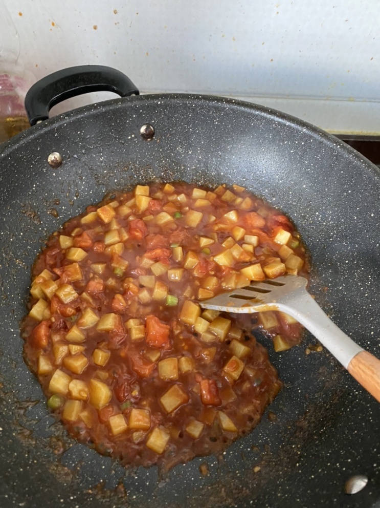 2.倒入土豆翻炒至浓稠状态,并加入生抽,老抽,蚝油,盐,鸡精,稍微咸一点因为要加水所以咸一些比较好,然后转小火炖土豆