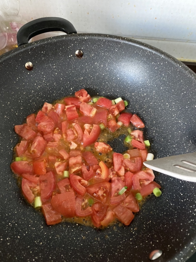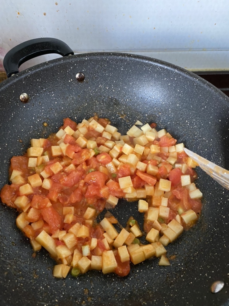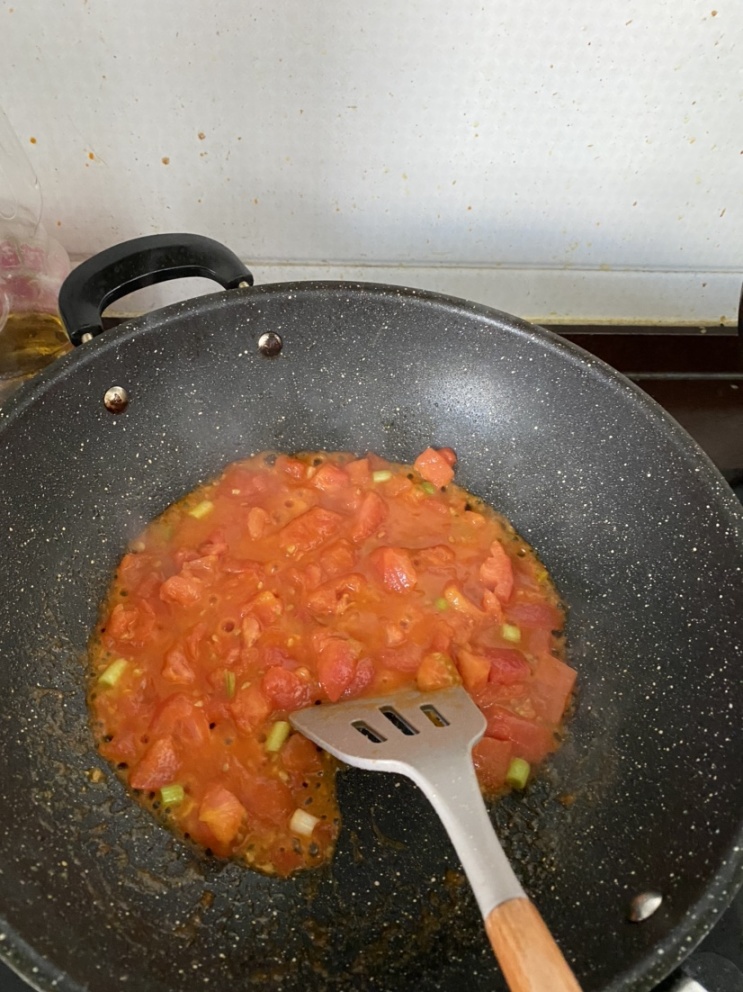 4.面不要煮太软,八分熟关火,将面倒入炒好的番茄中