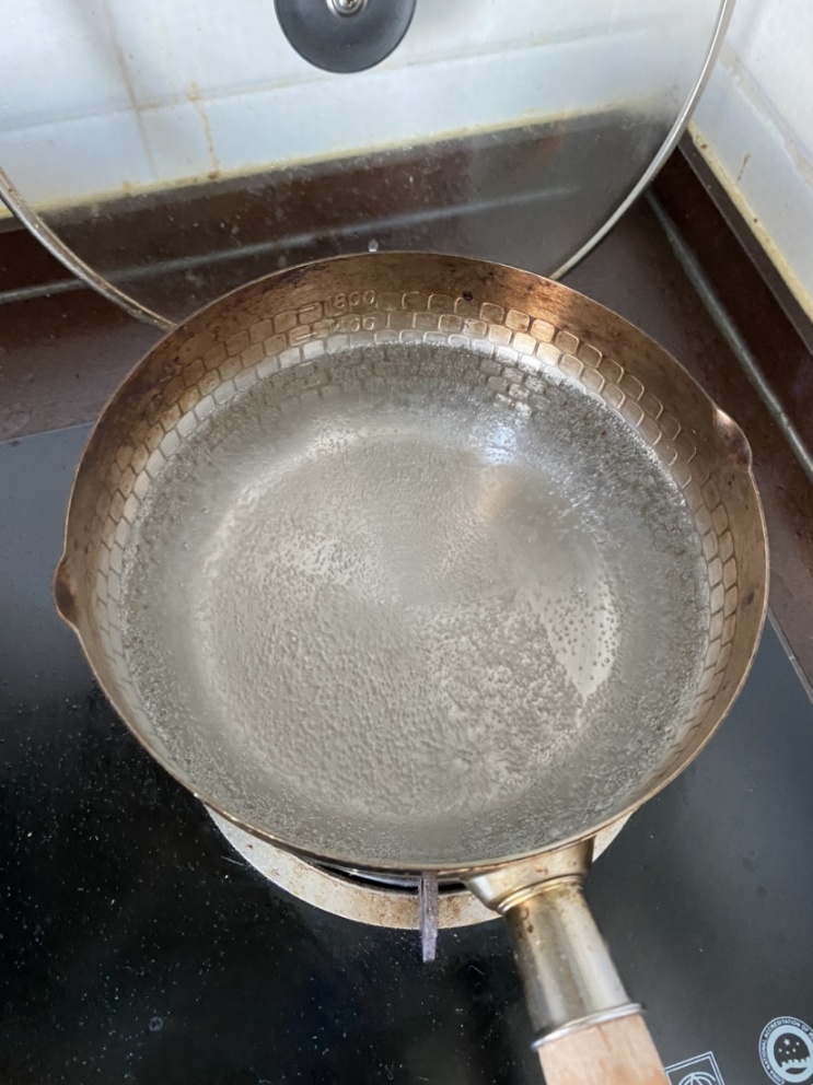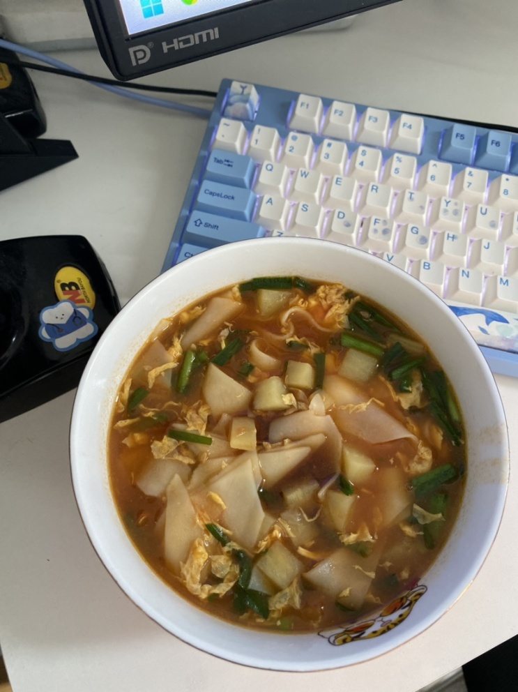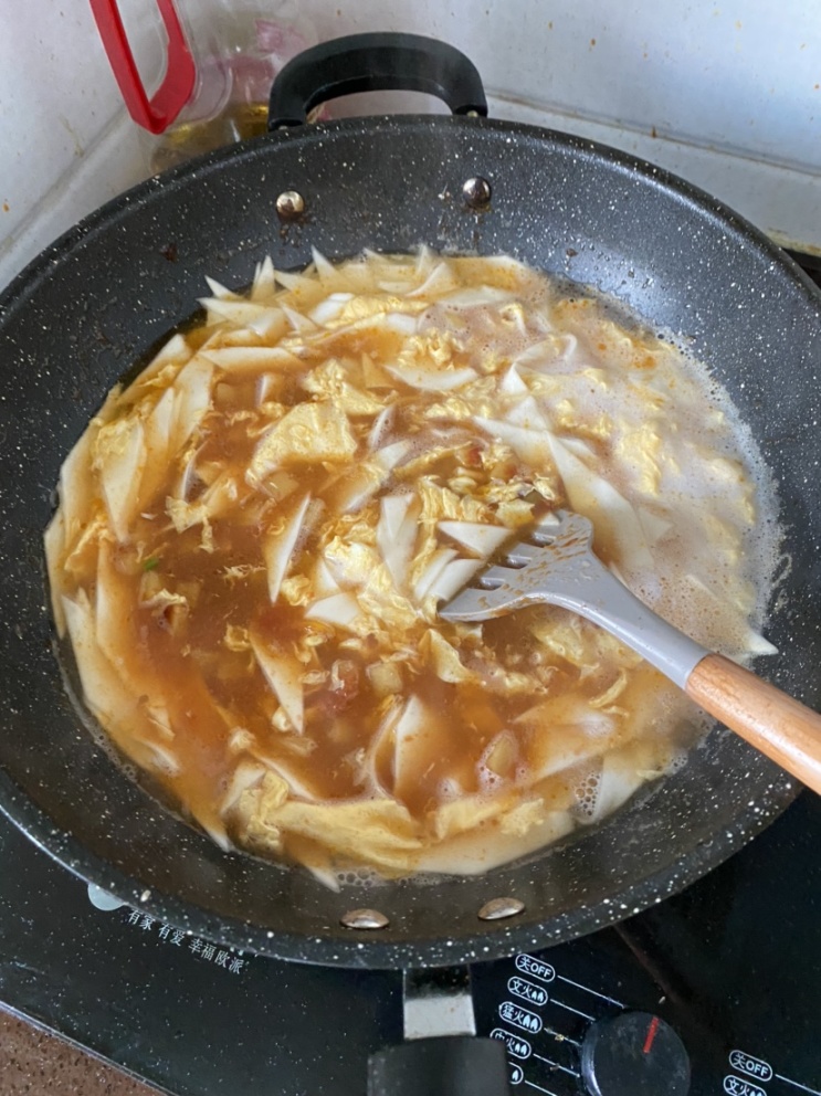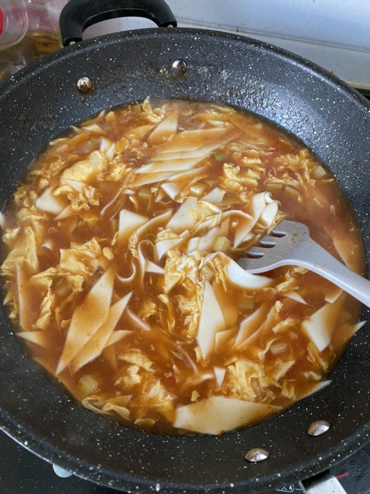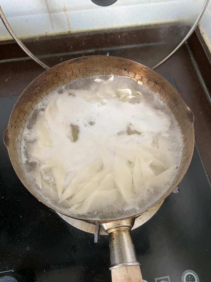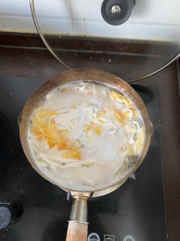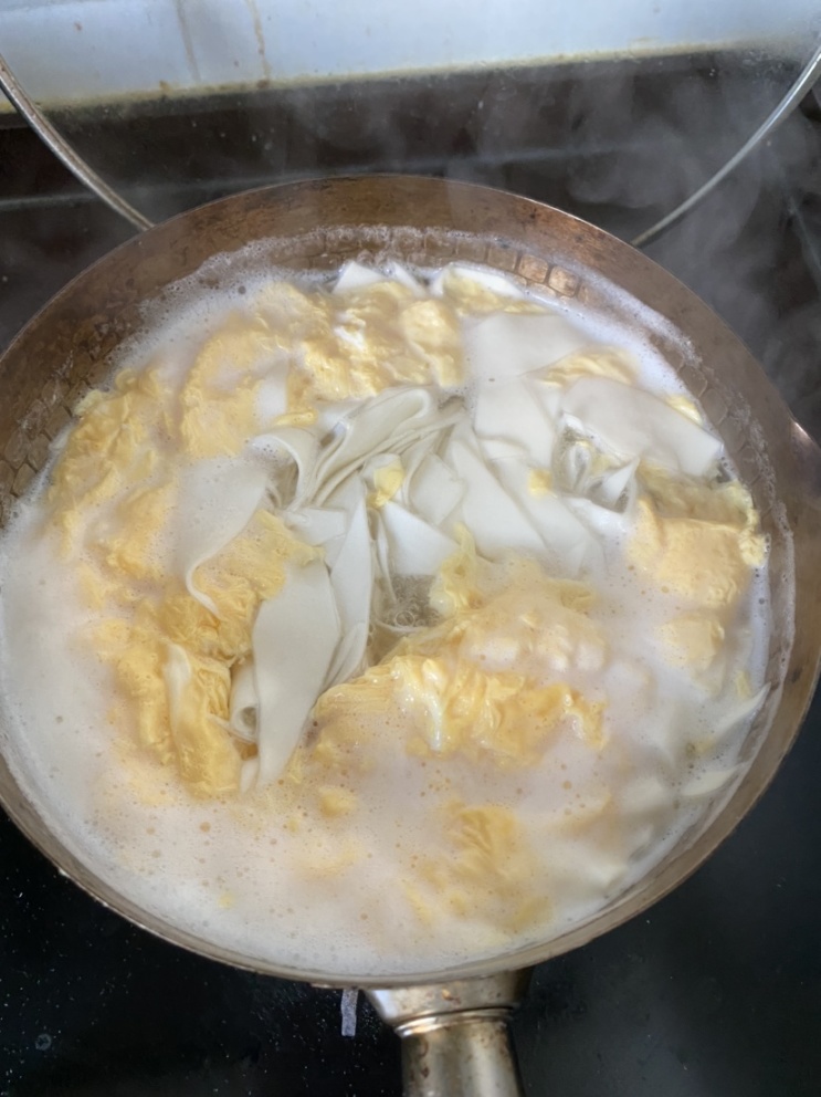 3.起锅烧水,水开下面片,水再开的时候,倒入打散的鸡蛋