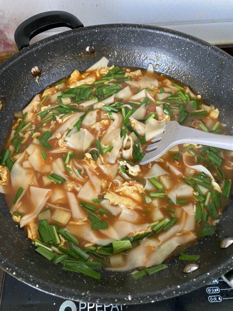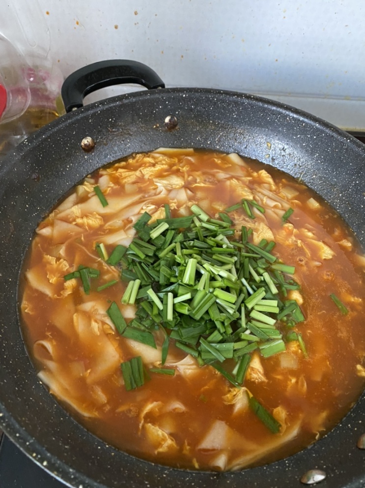 5.开中火继续搅动,尝尝咸淡加盐,快熟的时候加入韭菜段