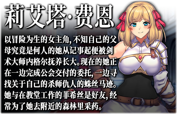 莉艾塔·费恩是一名生活在吉赛利亚帝国的冒险者。她不知道自己的父母究竟是何人,因为从记事起她就被剑术大师内格尔抚养并教导,直到自己长大成人。但天有不测风云,内格尔突然被某人暗杀,而莉艾塔·费恩也一边冒险一边寻找着凶手。