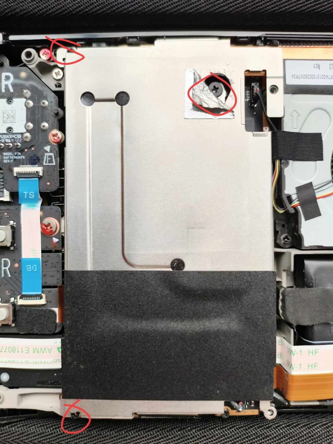 镜头放大,揭开一半防滑贴(不用全揭)并拧下三颗螺丝。