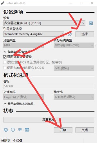 插入u盘,打开rufus,点击选择,选择在官网下好的steamos映像文件,点击开始,等待数分钟,完成。注意,这个操作会将你的u盘格式化。