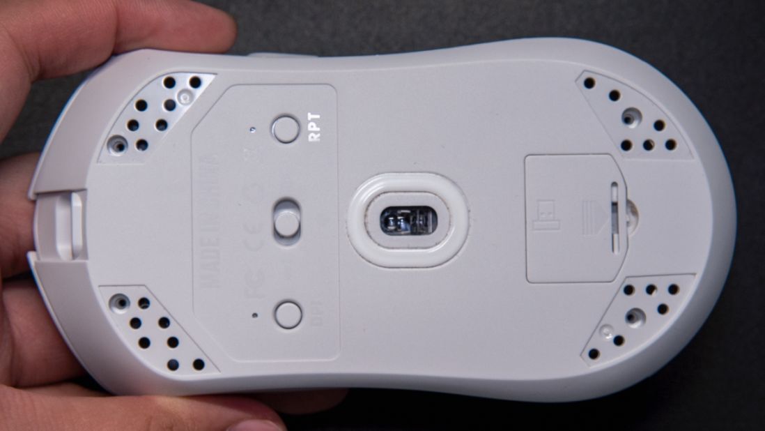 整隻鼠標的外殼僅有1mm,剛度極低,底殼和側裙位置格外明顯,上手輕輕一捏就會發生形變。