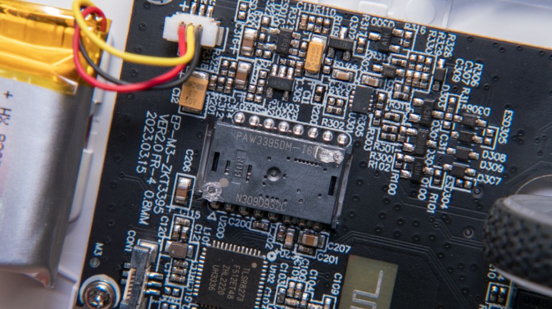 傳感器3395不多說,無線IC和前幾天測的keychron M1相同,採用了泰凌微的TLSR8273,32位 RISC架構MCU,48MHz 主頻 、64Kb RAM、512Kb ROM,支持藍牙5.1和2.4G私有協議,且支持無感喚醒。