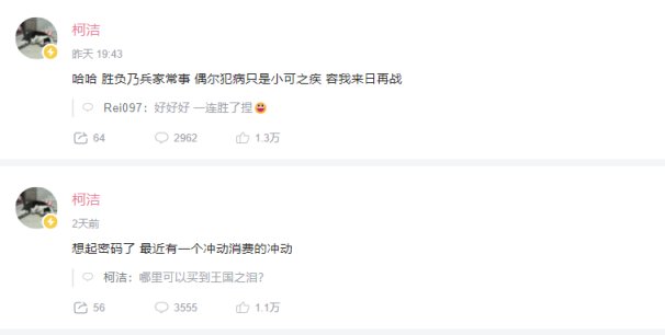 第147手,柯潔葬送好局,送掉大優局面,算上爛柯杯首輪,柯潔已經遭遇三連敗!今天,柯潔對陣李欽誠取勝,終結了自己的三連敗,在此期間也是多次在BB空間發文,說自己最近有個衝動消費的衝動,並詢問哪裏可以玩到《王國之淚》!
