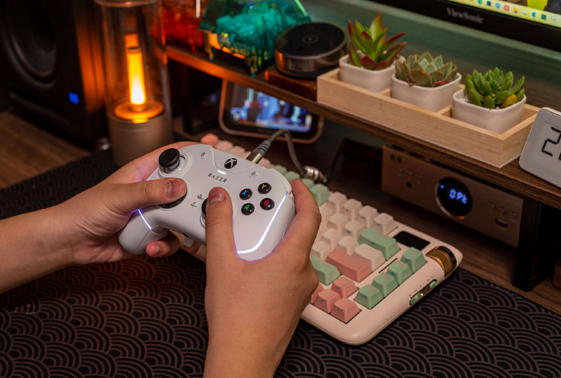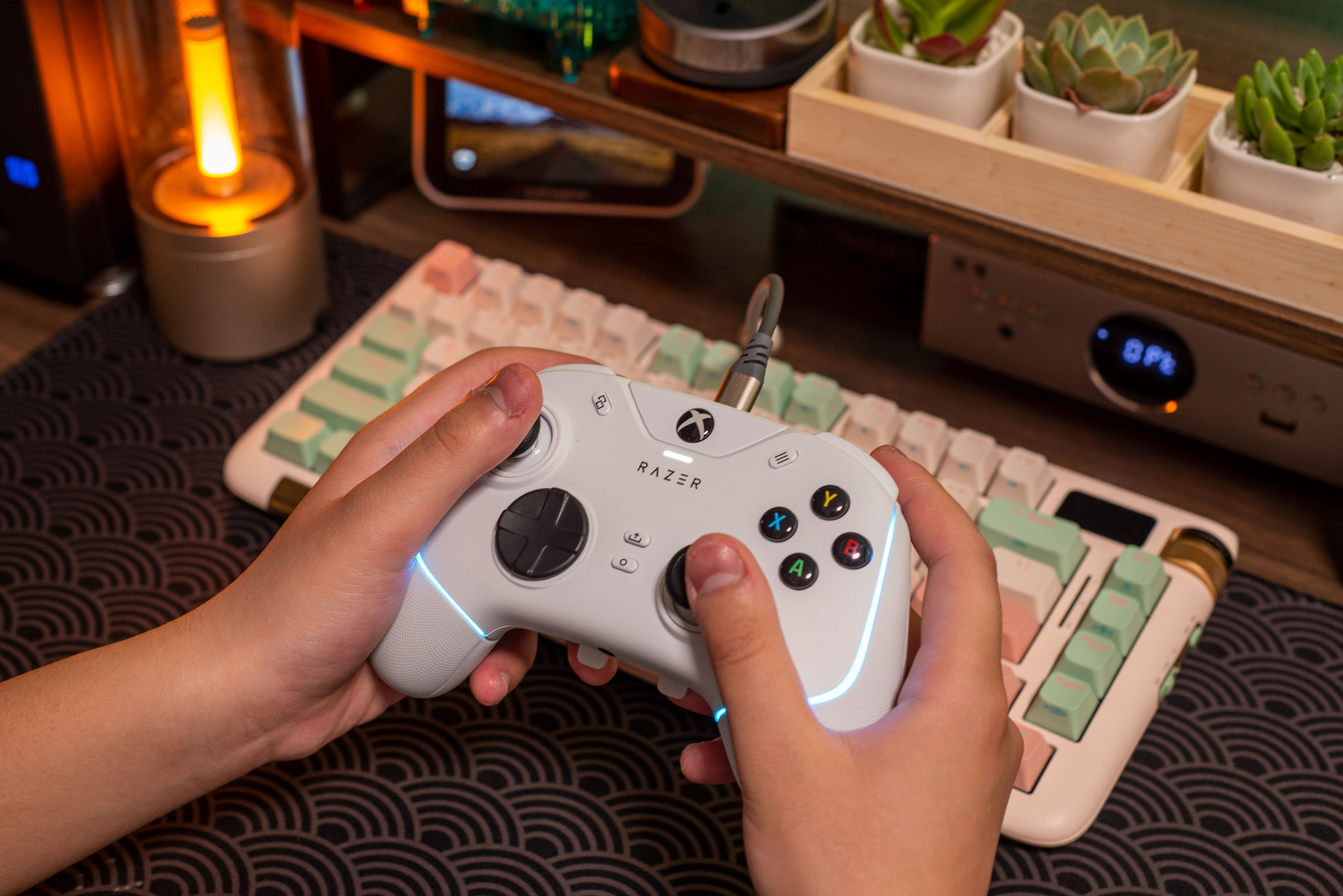 ▼灯效方面是雷蛇的强项,连接主机时两侧的灯带和 XBOX 标示都会亮起,1680W 颜色和丰富的灯光效果可以带来更沉浸的游戏体验,另外,手柄支持 RAZER CHROMATM RGB 灯效,可与雷蛇的其他设备实现灯效联动。只是可惜按键区域没有灯光有点小遗憾。