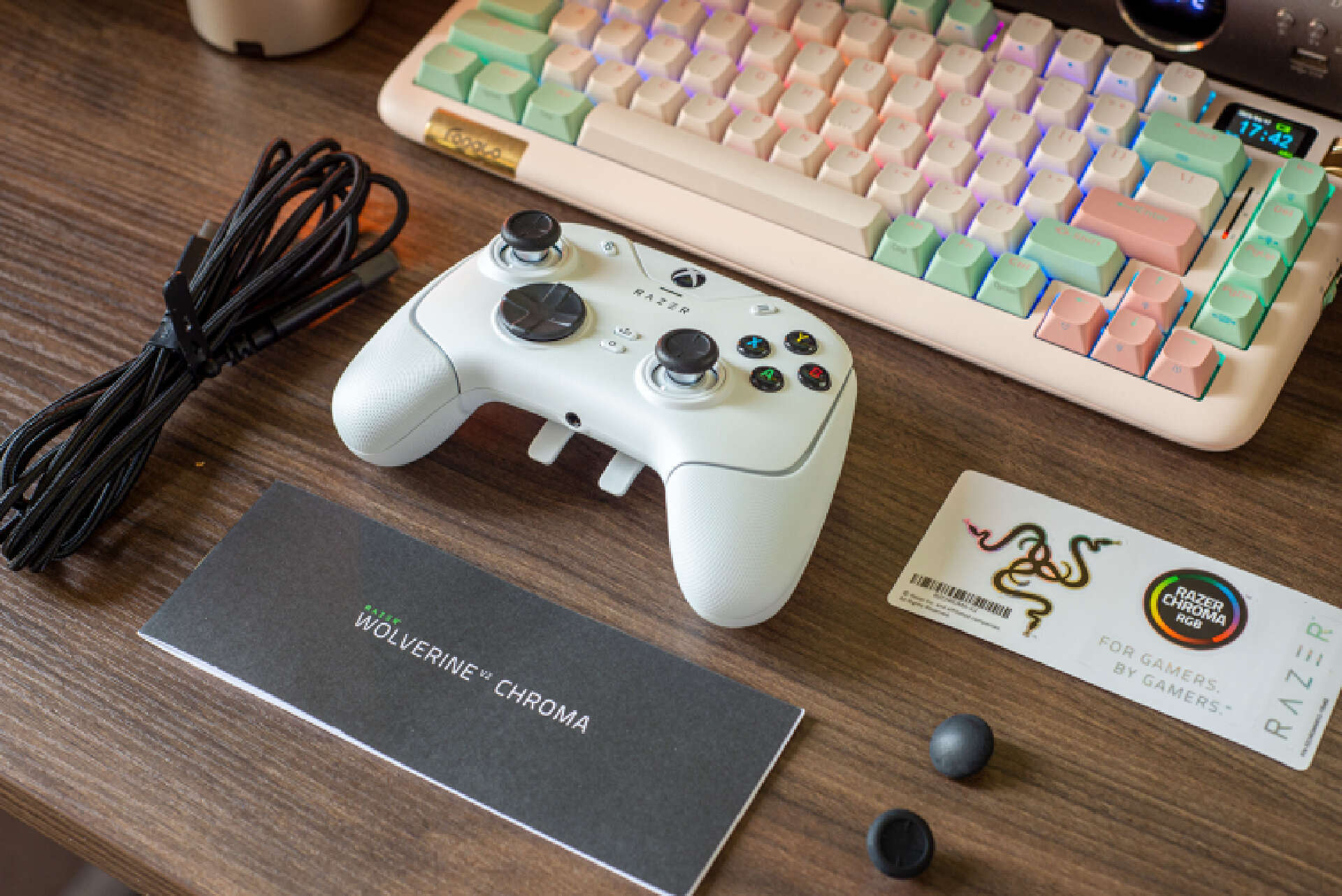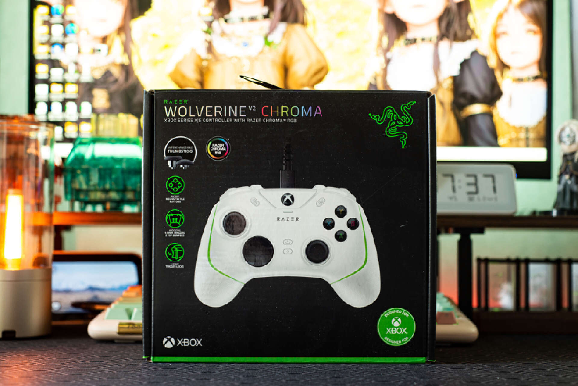 ▼包装依然是雷蛇经典的黑绿配色,正中间为手柄实物图,下方左右的 XBOX 标示表明可以完美适配 XBOX 主机,左上角的卖点包括支持雷蛇RAZER CHROMA RGB幻彩灯效、6个额外多功能按键以及键帽可更换等等。