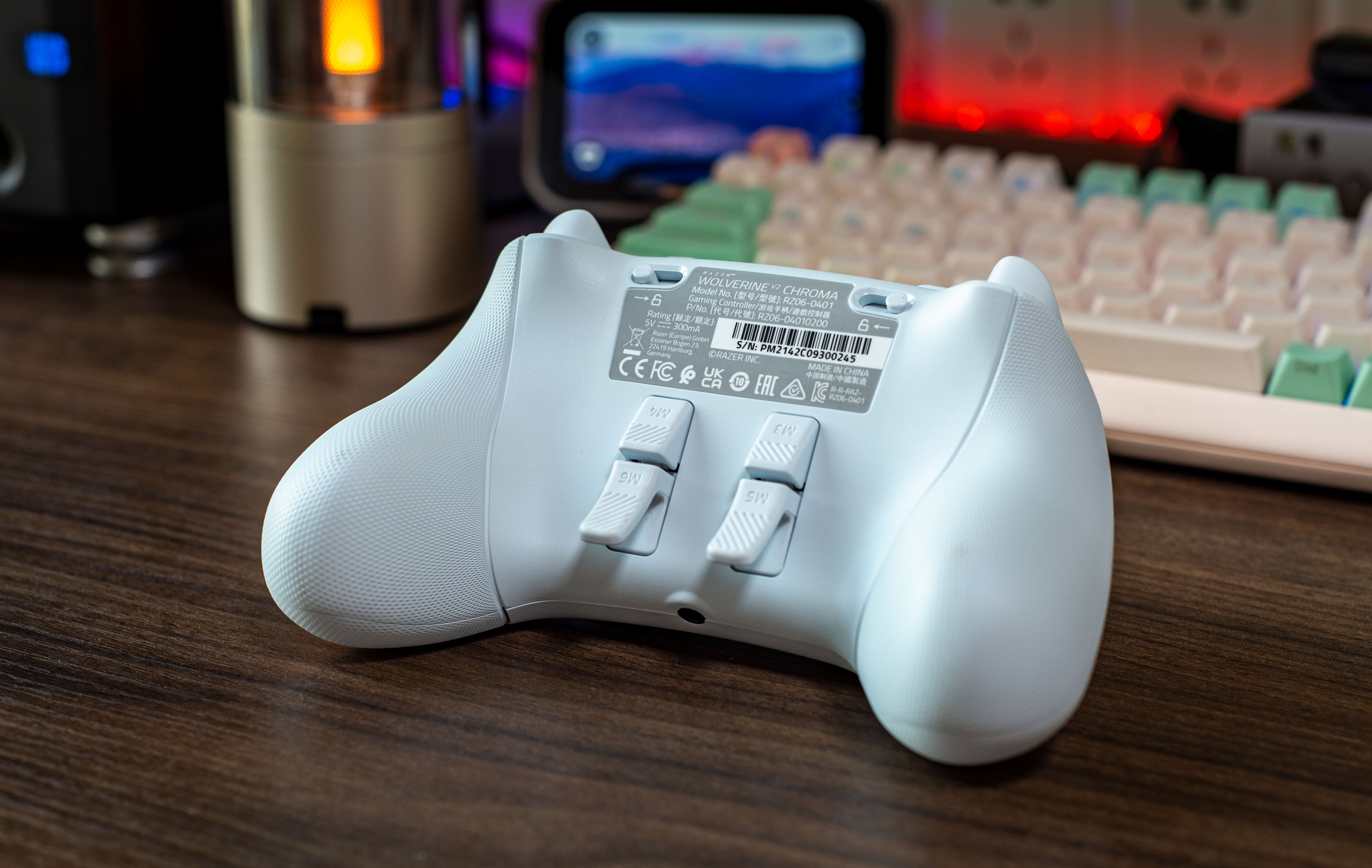 ▼上方两个扳机锁对应肩键的键程调节,线性激发与快速触发两种模式对应不同游戏类型。可以看到,虽然按键数量较多,但双手握持时手指都很自然的落在按键上,使用上没有什么不适感。