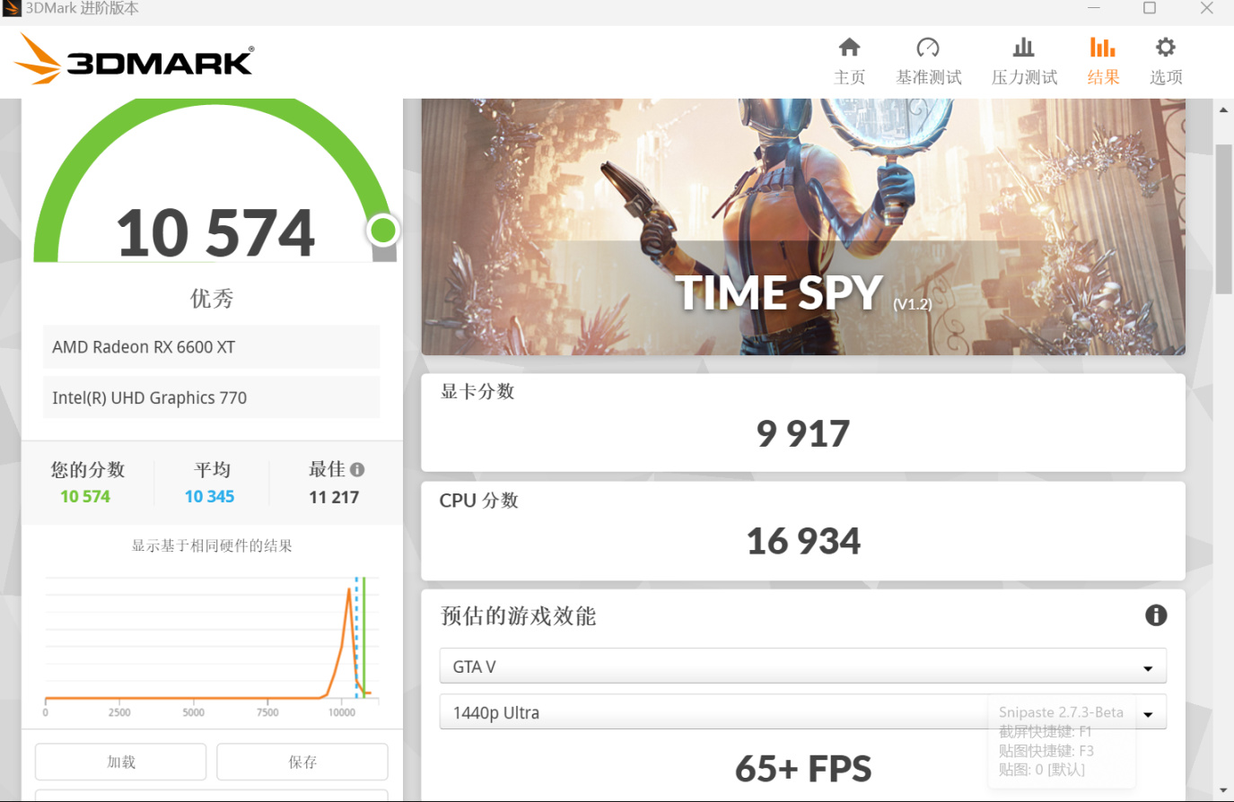 ▼3D mark Time Spy Extreme得分 10574。显卡分数 9917、CPU 分数 16934。预估 GTA V 在2K 分辨率下能跑出 65+FPS 。