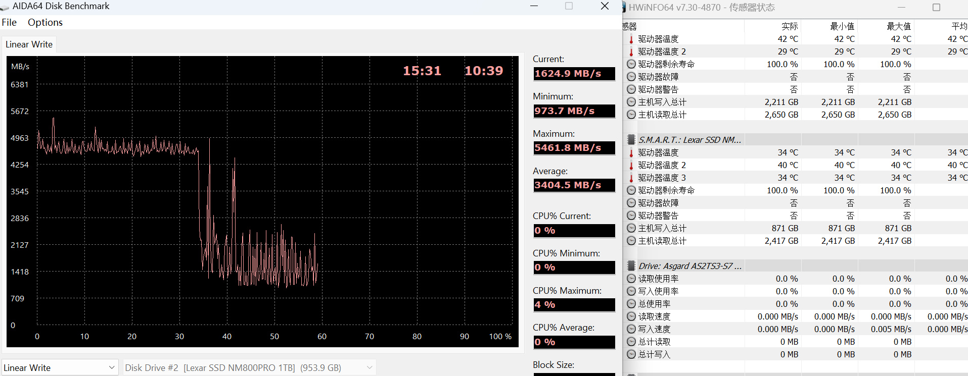 ▼利用 AIDA64 进行 SLC Cache 全盘写入测试,从数据来看,NM800PRO 1TB写入最大满速可以达到 5461.8 MB/s,缓内曲线大致位于稳定在 4800MB/s左右,缓外曲线在 3405 MB/s 左右,整体曲线过渡平缓,没有陡降式掉速,整体表现还是很不错的。