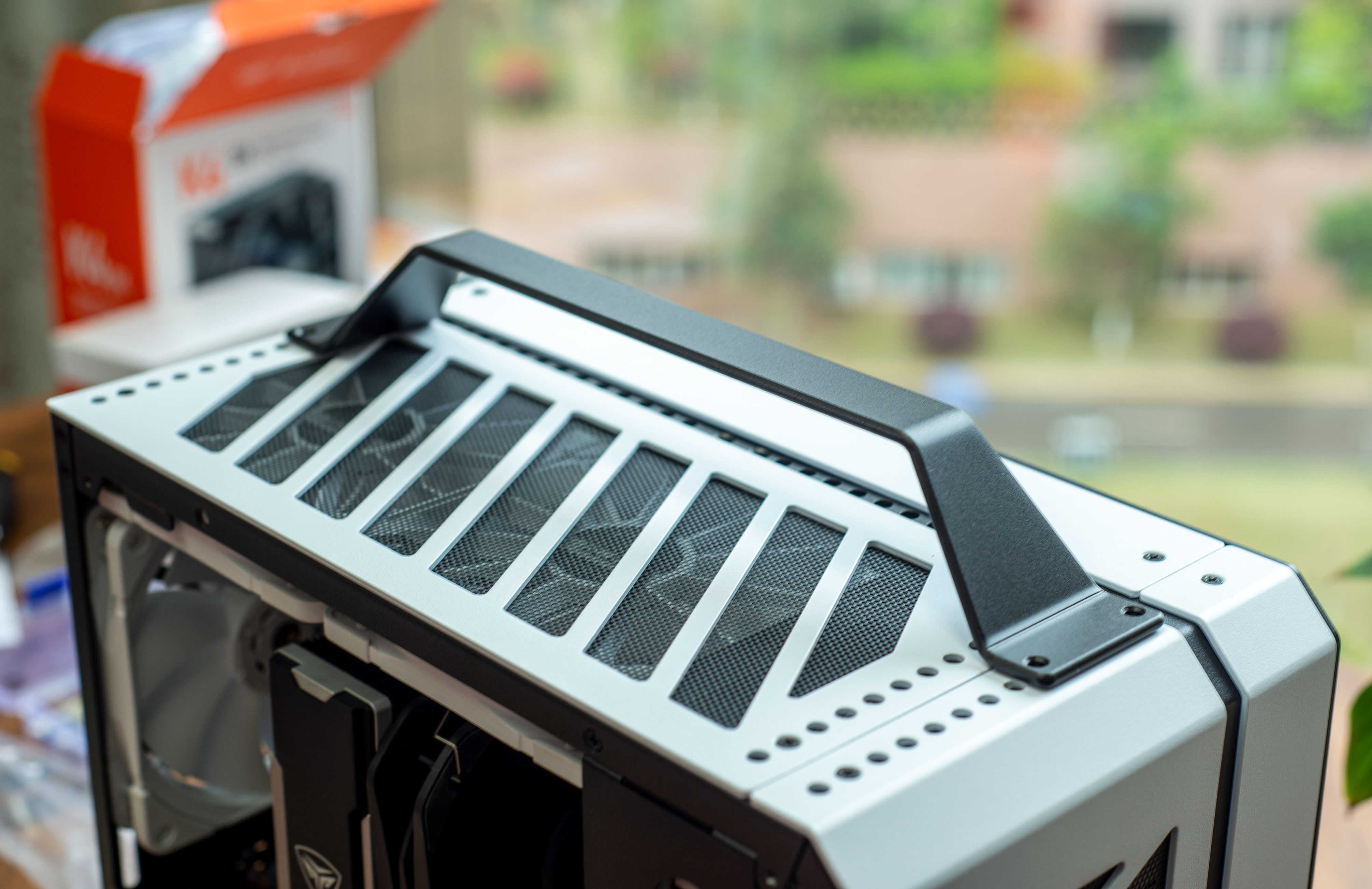 ▼顶部硕大的散热区域,自带防尘网,金属提手既是点缀,又方便手提移动。
