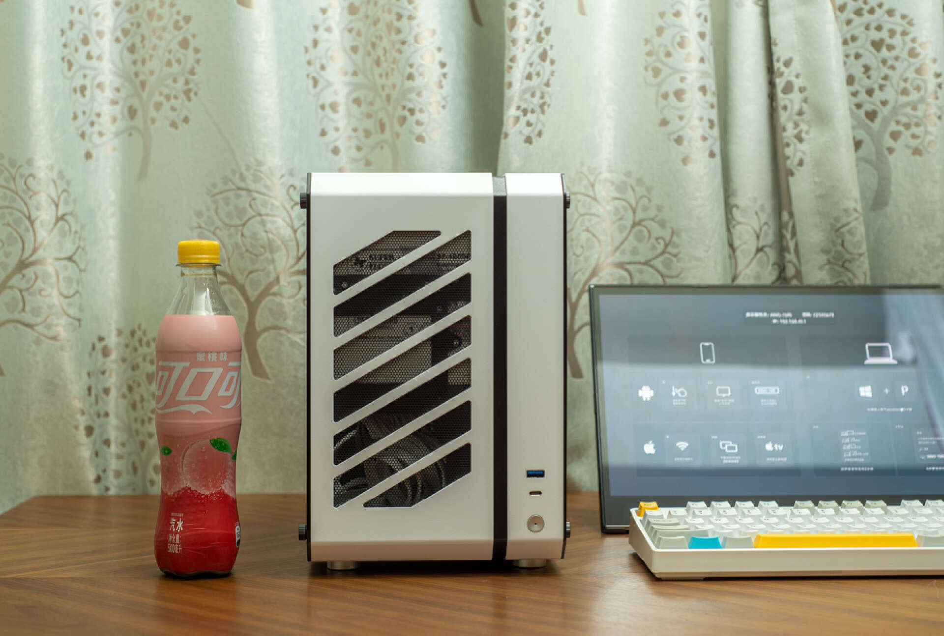 ▼和饮料瓶的对比,可以让大家更直观感受机箱的个头。