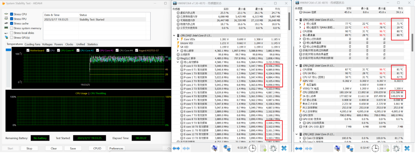 ▼下面来看看整机的散热表现。环境温度 22°,运行20分钟双烤测试,性能核(P核)有效运行频率4.1Ghz,能效核(E核)有效频率平均频率3.1Ghz。重点是温度这里,20分钟火力全开处理器核心温度平均77度,CPU封装温度才81度,平均功耗 151W。不到 200元 的单塔风冷,感觉不比水冷来的逊色。