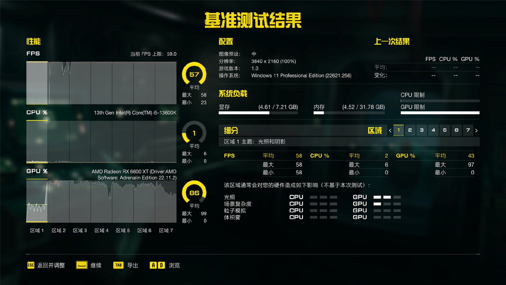 初次进入游戏,不调整任何选项,系统默认采用 4K分辨率、图像质量中进行测试。平均帧率 58FPS,不过看选项应该是锁帧了,总的来说这游戏用 6600XT 跑 4K 是没什么问题。