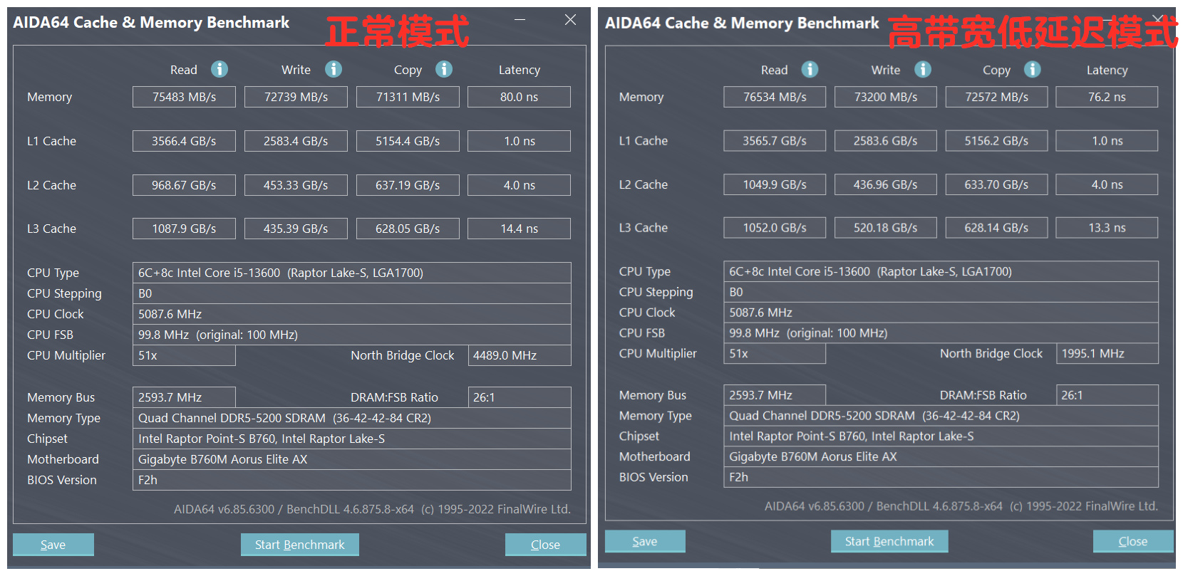 ▼技嘉从 b760 D5 主板开始,推出了个“高带宽低延迟模式”,同样的 DDR5 内存条在这块板能跑出更高的读写,更低的延迟,就拿雷克沙这套内存来说,同样的 5200MHz 开启这个模式后,相比正常XMP模式下数据都有不小的提升。