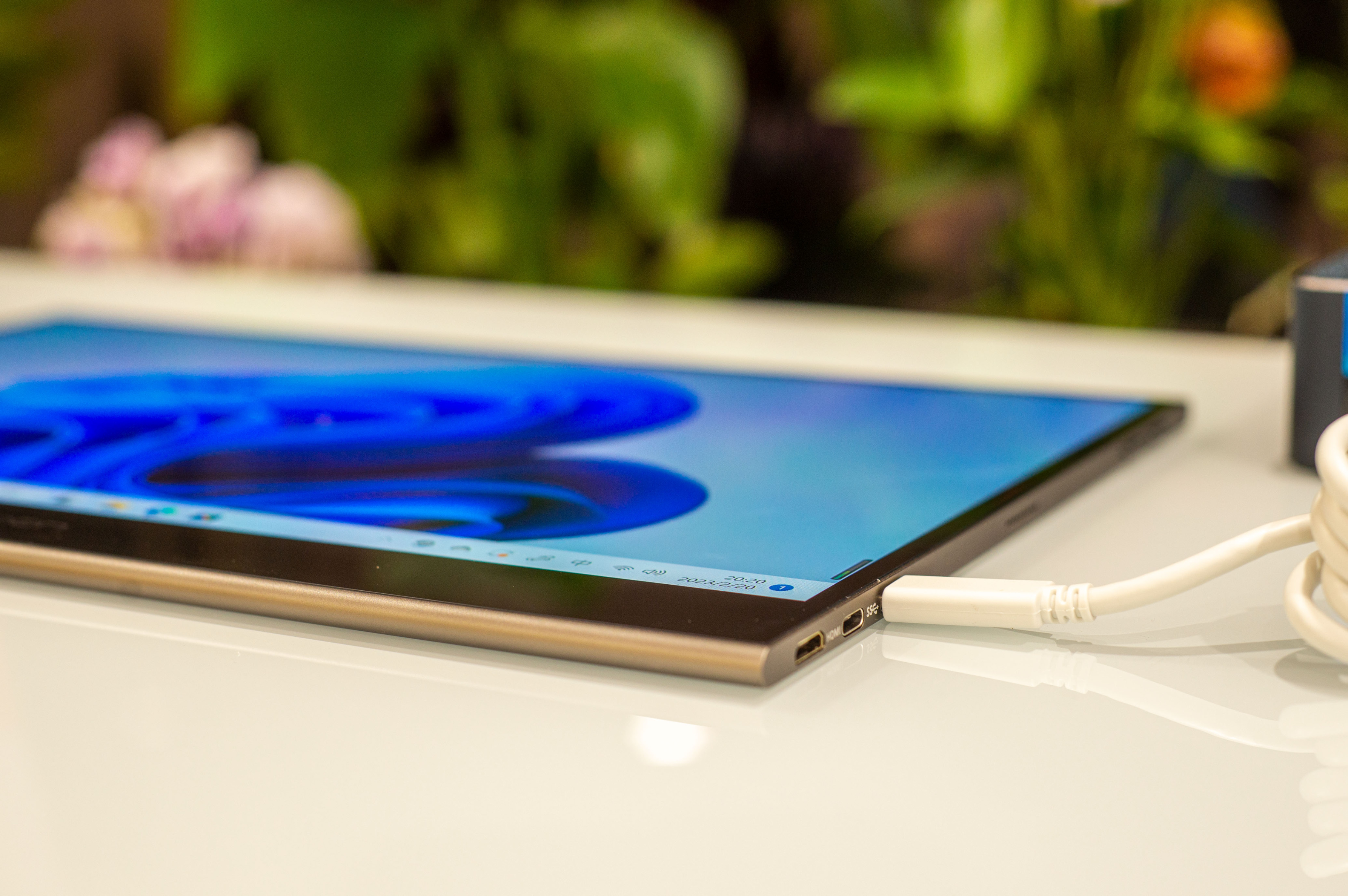 ▼做工方面,15Q1F使用的香槟金配色 + 全贴合屏 + 金属边框,将厚度压缩到了 6.8mm,整体质感还是比较出色的。重量 0.94kg ,单手握持毫无压力,长时间使用有专用的皮套提供倾斜角度。接口是 Type C X 2 +Mini HDMI 组合,可以实现一线连功能(供电与信号传输一线达成)。