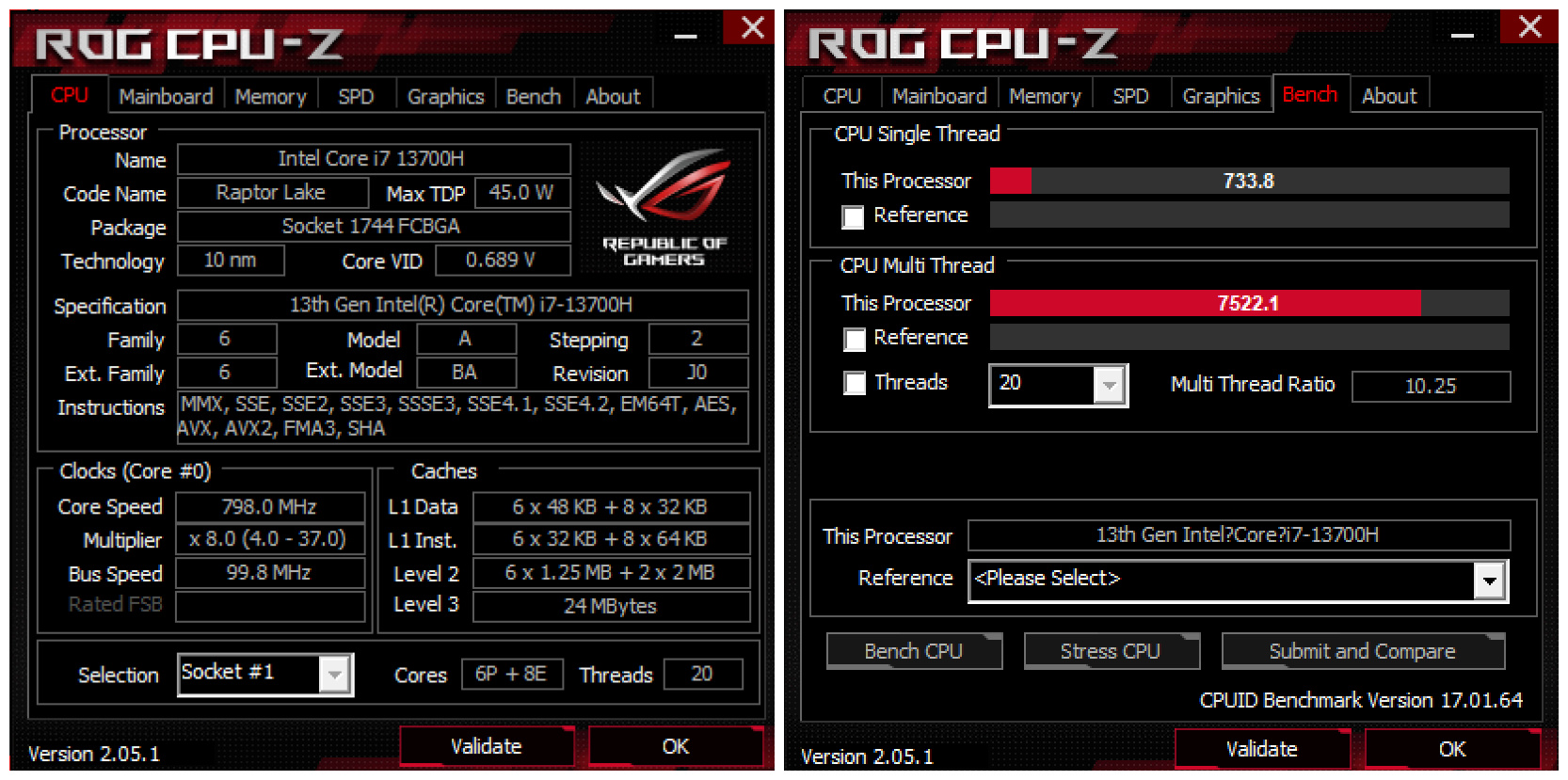 ▼CPU-Z 单核跑分733.8、多核跑分7522.1