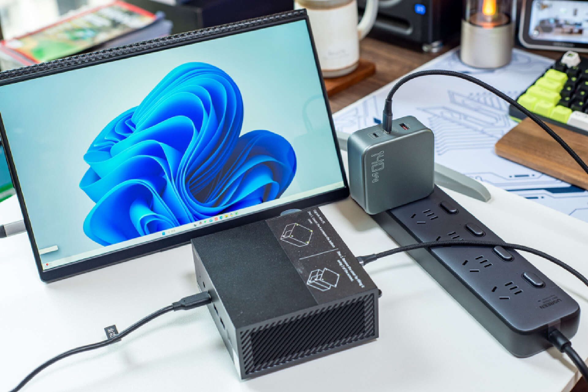 尾部的 Type-C 是全功能的,支持 PD快充/视频输出,可以接显示器或者便携屏,实现供电 + 信号传输。也可以用大功率氮化镓电源代替标配的砖头电源,唯一需要注意的是电源需要在 120W 以上,比如我这款绿联的 140W氮化镓充电器。
