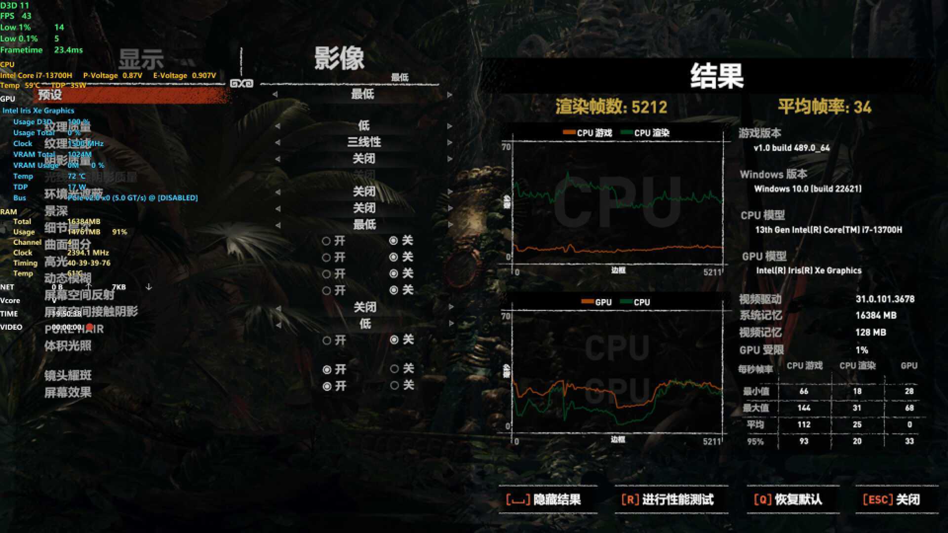 ▼古墓系列是我的最爱,每代我都翻盘不止三次。这个系列提供了专门用于游戏测试的 BenchMark 工具。画面分辨率设为 1080P,性能优先模式下可以提供接近 30+ 帧的游戏体验。