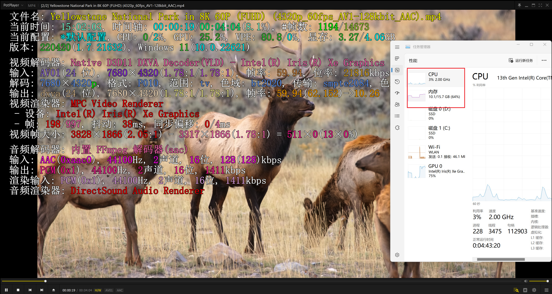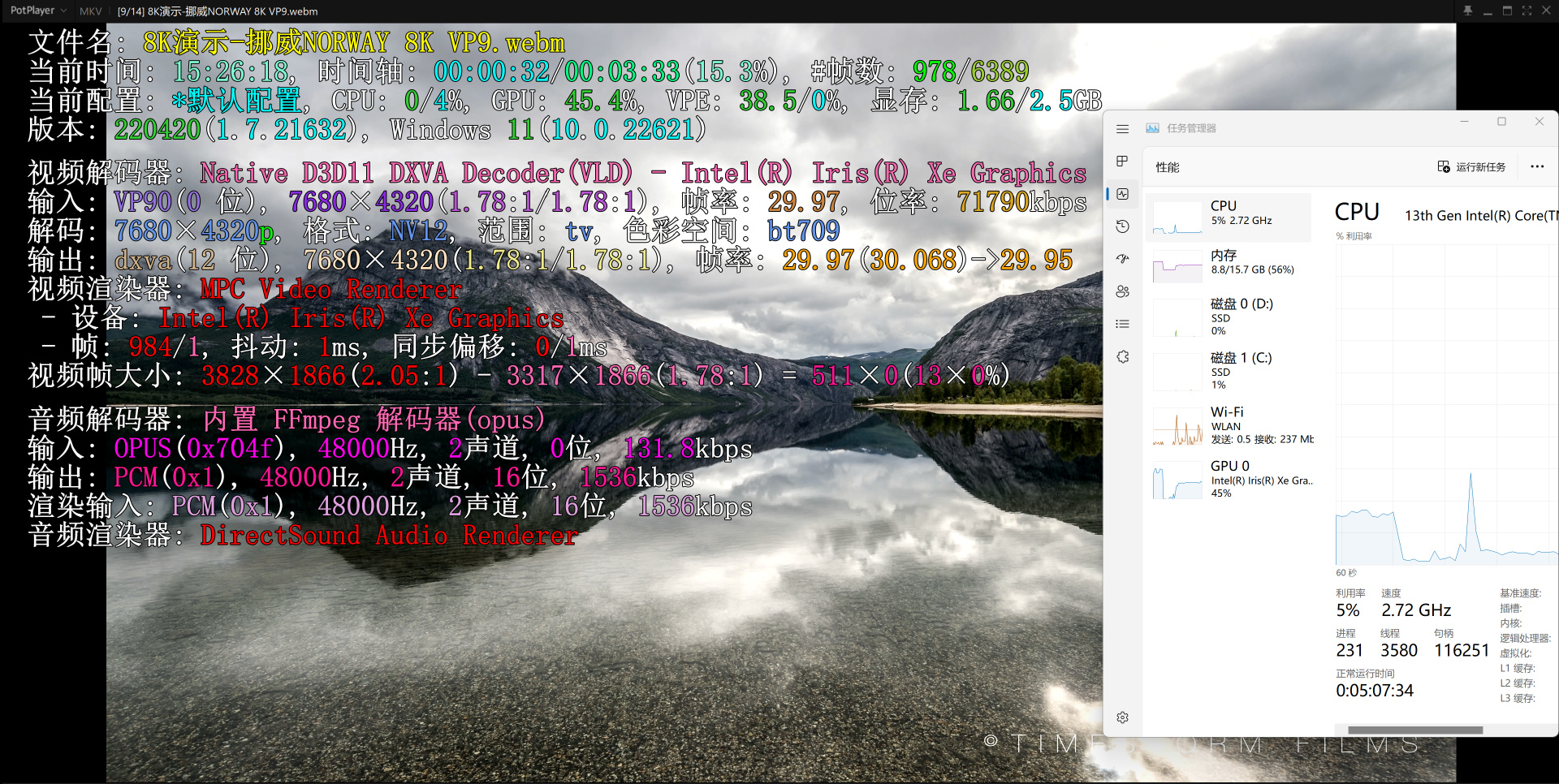 实测 8K@60FPS 视频播放无压力,CPU 占用才 3%,这也说明了为啥流媒体网站开始力推了,占用越低对服务器要求就越低。