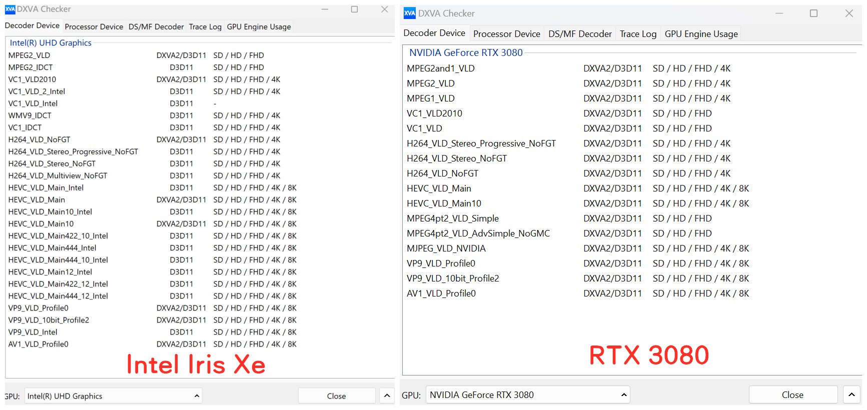 ▼13700H 搭载的核显为Intel Iris Xe Graphics,支持主流 4K/8K 编解码格式,连最新的 AV1 编码都没有放过。很有意思的是,XE 虽然是核显,支持的甚至比老黄家的 RTX 3080 还丰富,对比图如下