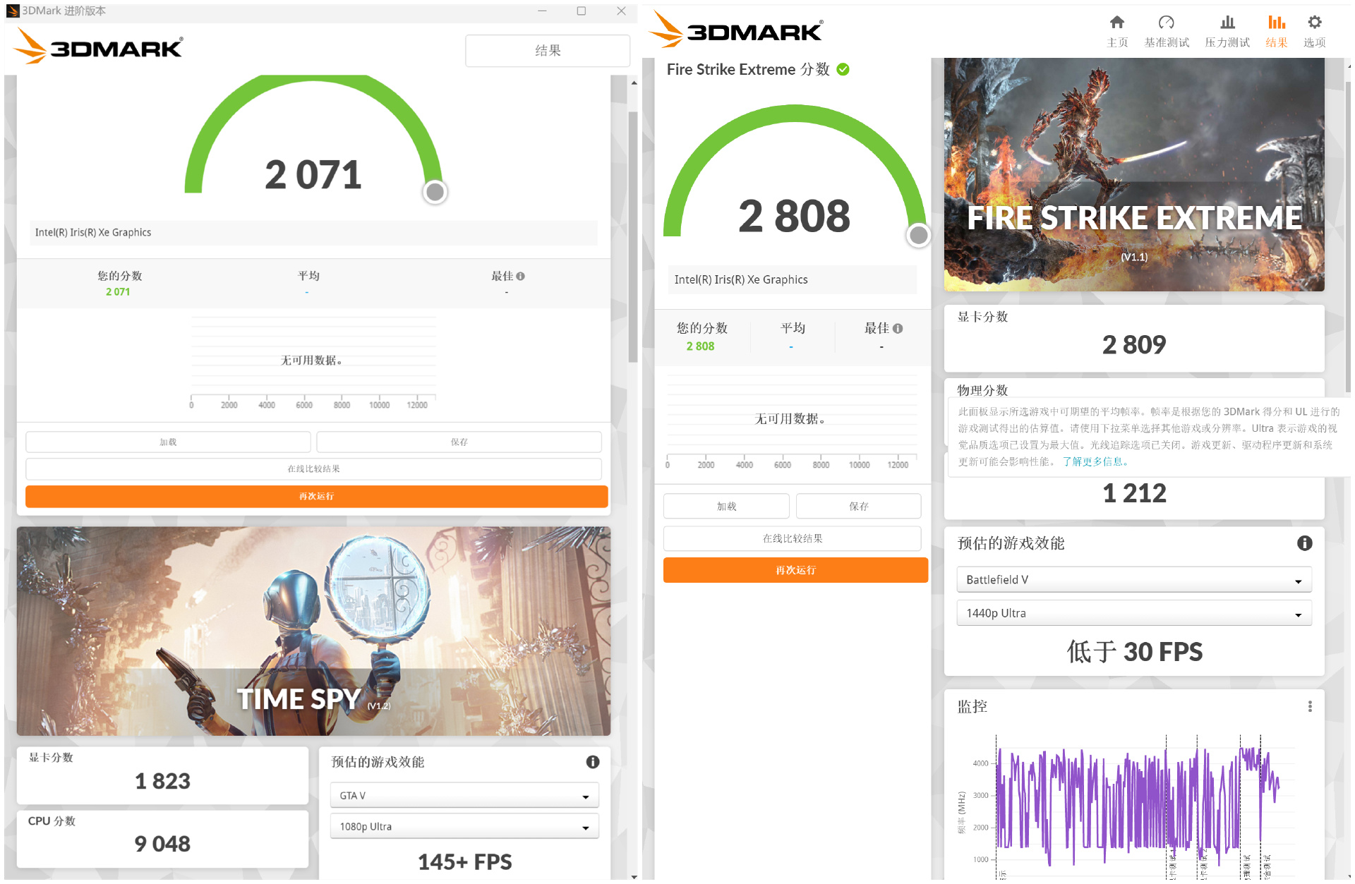3D MarkTIME SPY 得分 2071,显卡得分 1823,CPU 得分 9048