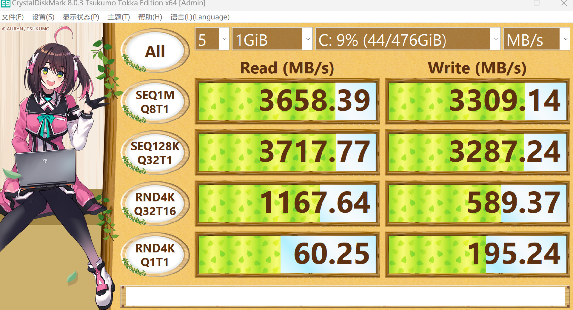 ▼标配固态是镁光2450,传输模式为 PCIe4.0 X 4,支持 NVME 1.4 协议 和 S.M.A.R.T.功能。使用 CrystalDiskMark 测试,顺序读取3658.39/s,顺序写入3309.14/s,读写速度比较一般,完全没有发挥 PCIe4.0 X 4 的优势,对性能有追求的话还是更换为佳。