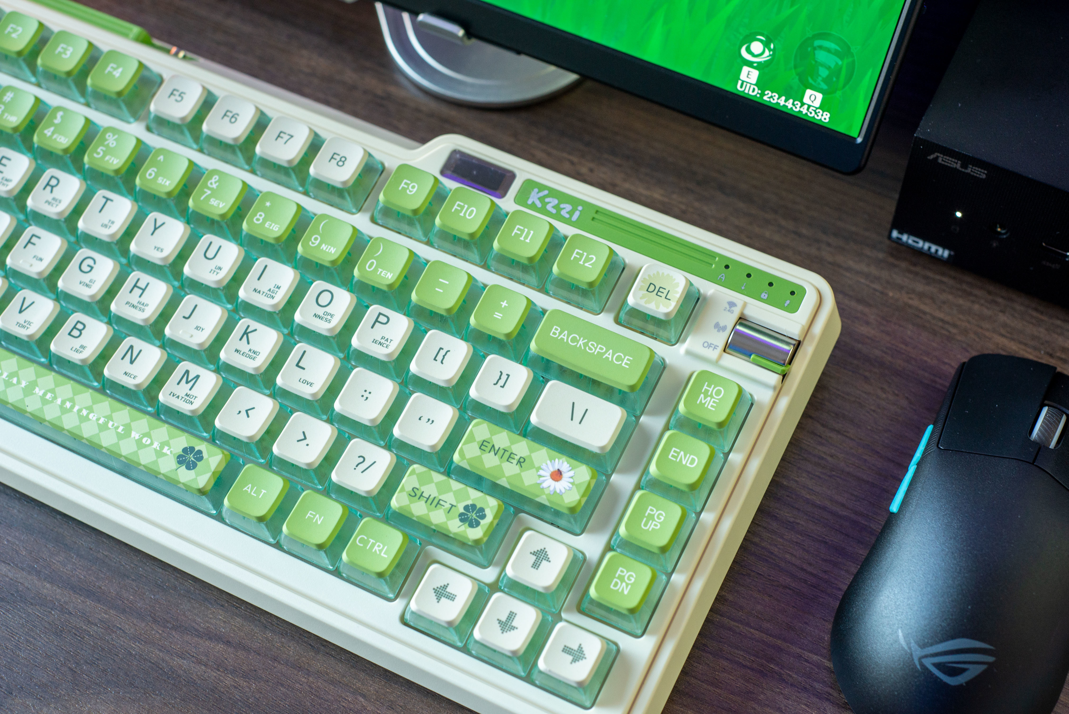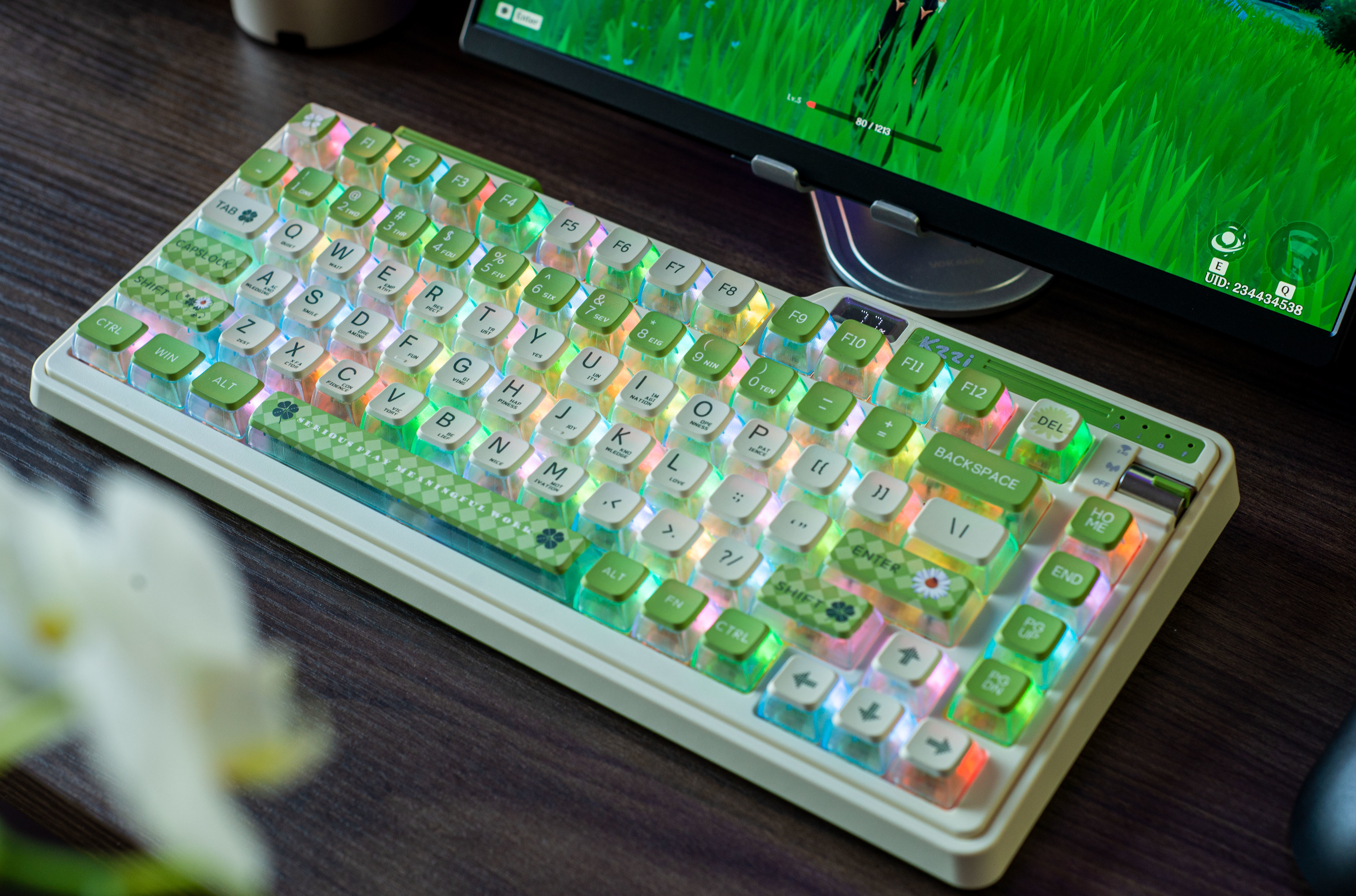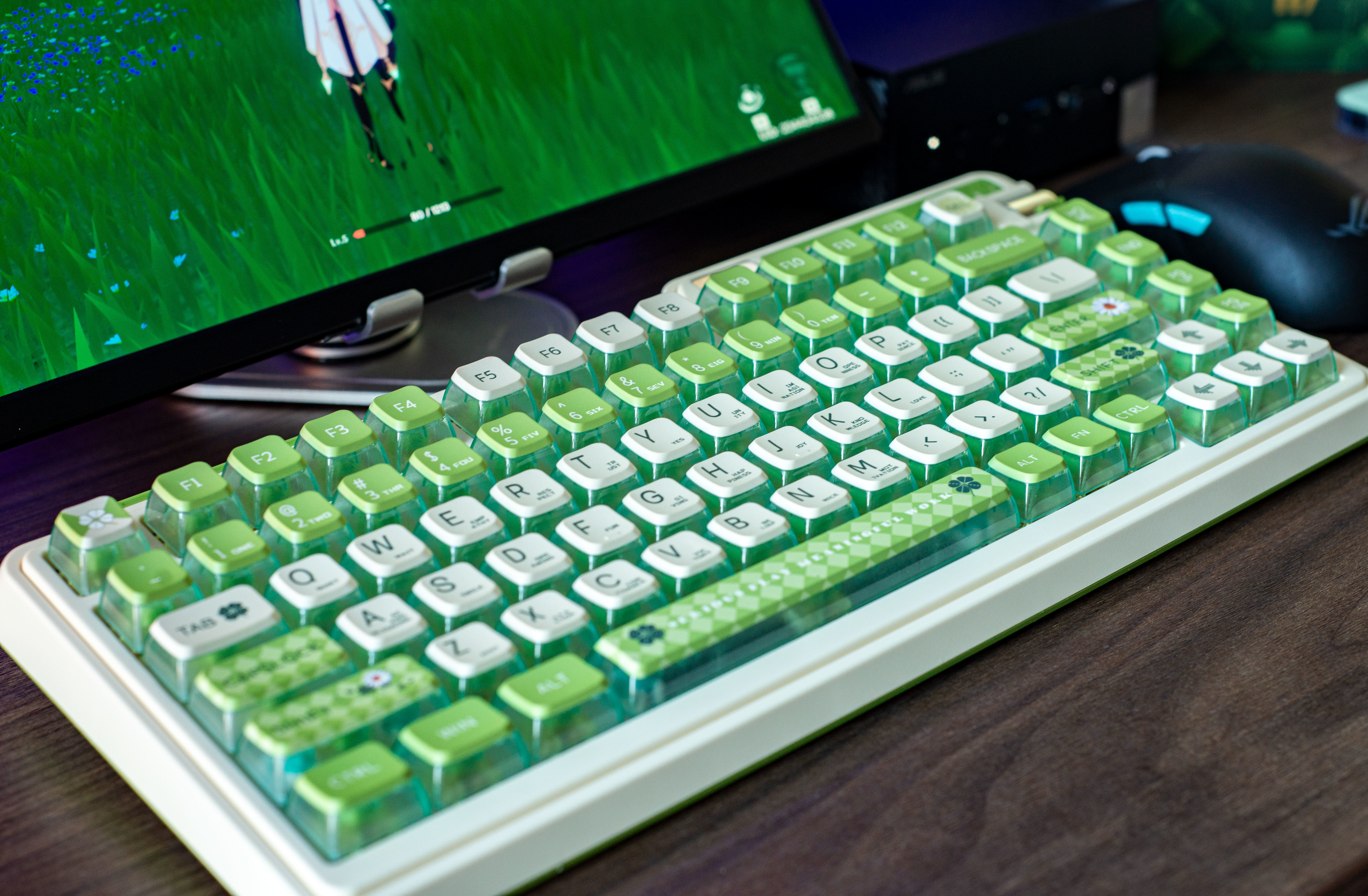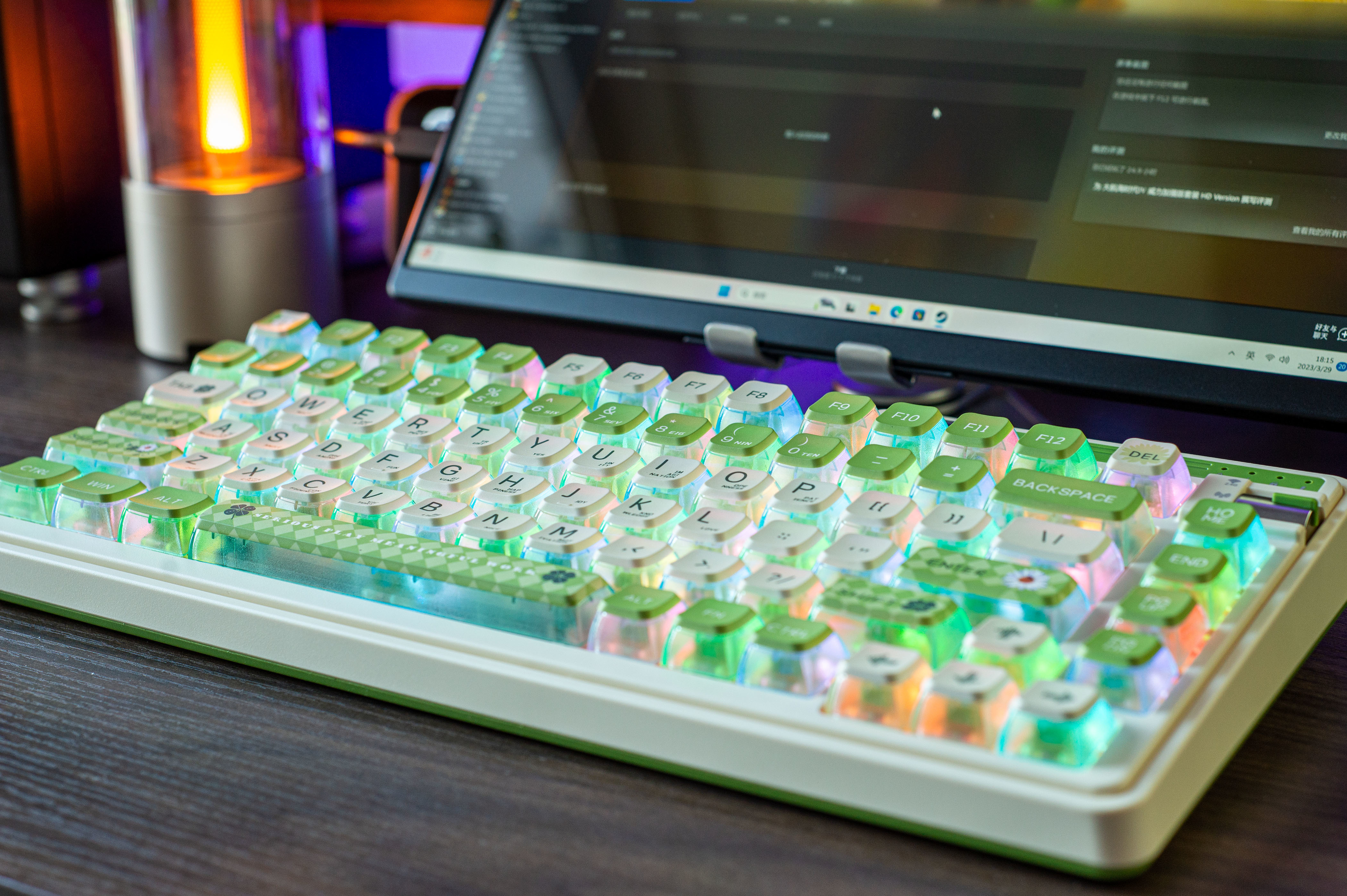 ▼其实我最感兴趣还是这套配色,白绿夹杂的色彩搭配很符合春日清新的气息,有种生机勃勃的感觉。轴体方面柠檬轴珂芝自己的定制轴体,触发力度42g,手感Q弹的同时搭配跟手极佳,属于办公游戏两相宜的轴体。