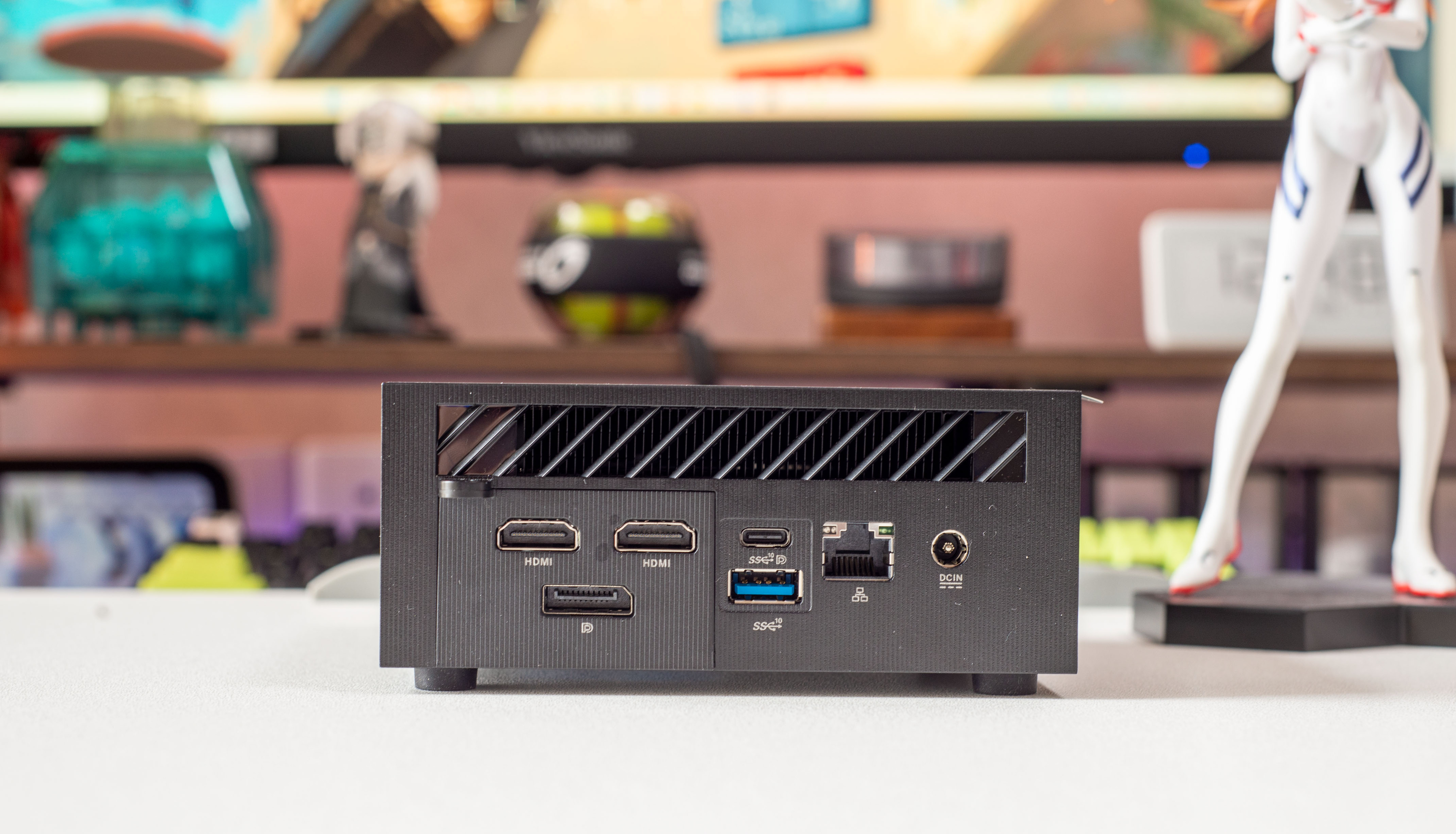 ▼大部分接口位于主机背部,包含1个全功能 Type-C接口(USB3.2Gen2协议)、1个USB-A接口(USB3.2Gen2协议)、2个HDMI2.1接口、1个DP1.4接口、1个2.5G电口网口以及DC供电接口,上方的散热孔以及1个物理设备锁孔。