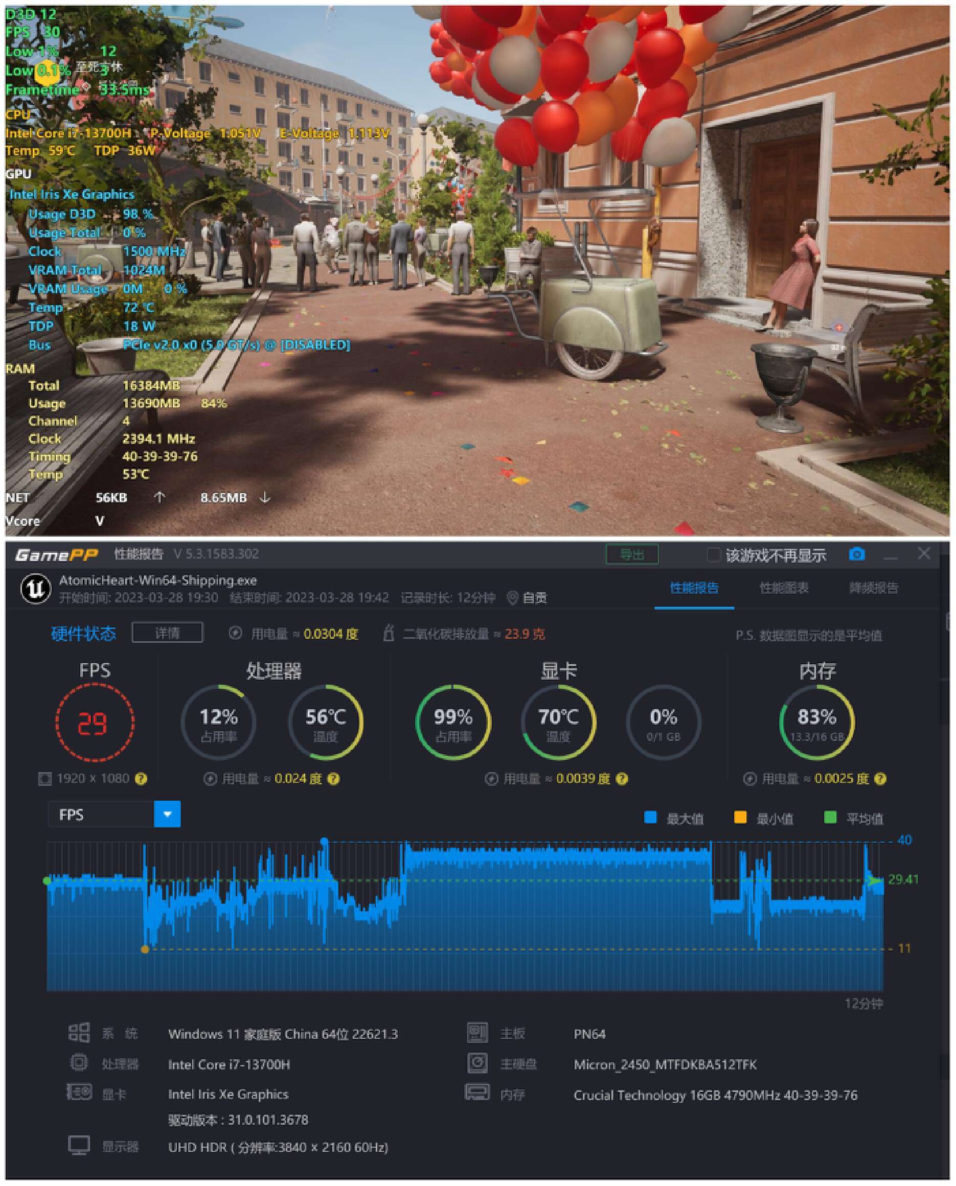 分辨率设为 1080P,性能优先模式下,游戏开场欢乐的集市整体帧率保持在 30FPS 左右,达到流畅的程度。不过在切换场景时渲染速度比较慢,显存拉了后腿。