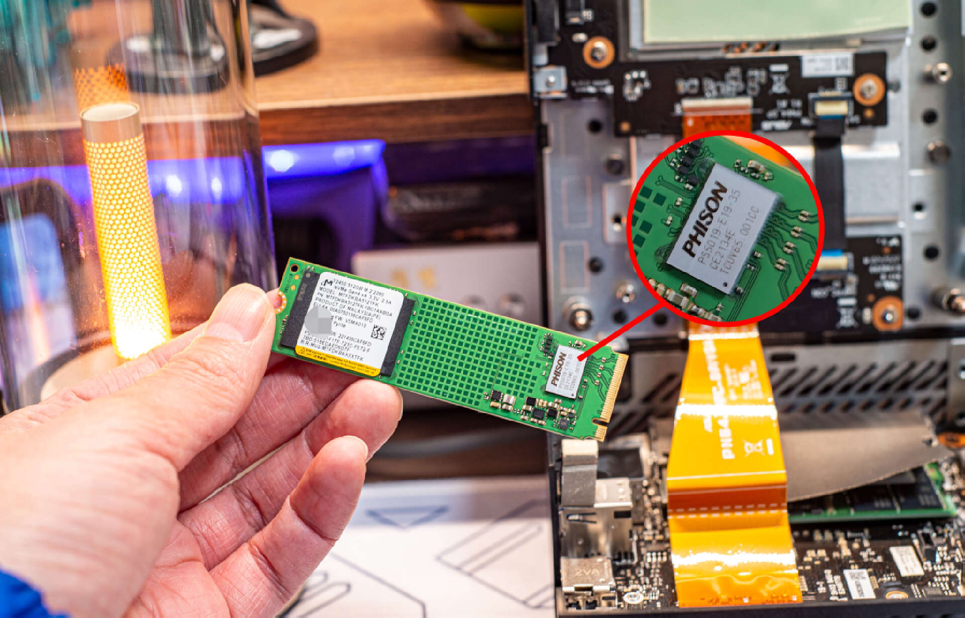 ▼存储方面,破晓X 搭载一条M.22280 PCle Gen4x4 规格插槽,标配一根512G 的PCIe4.0 协议固态硬盘,主控是群联旗舰级别 E19 主控,颗粒看不到具体信息。此外主还有一条2.5"HDD 位置,可以作为扩容盘来使用。