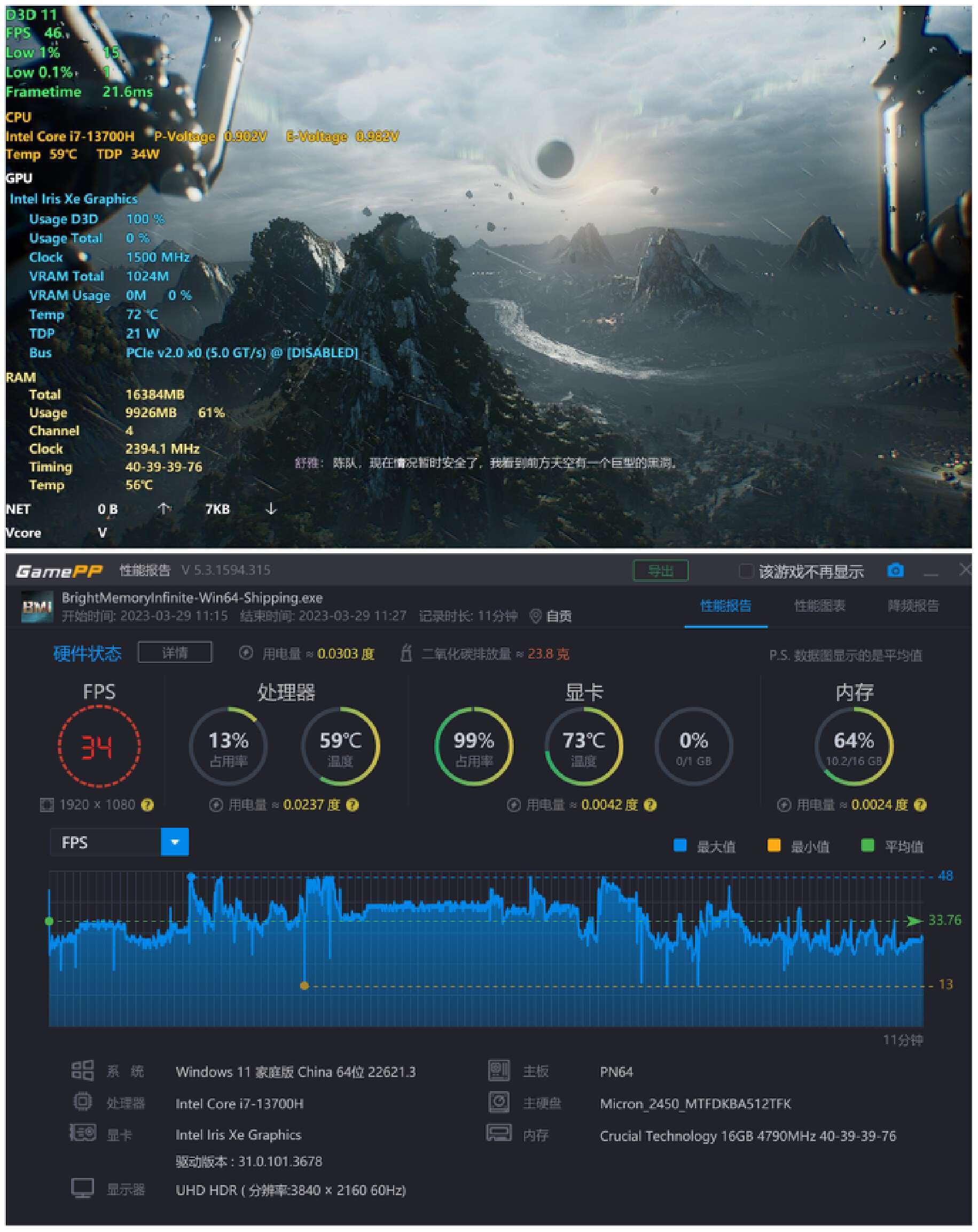 ▼1080P 分辨率,预设画质高,平均帧率 22FPS,最高帧率 34FPS。
