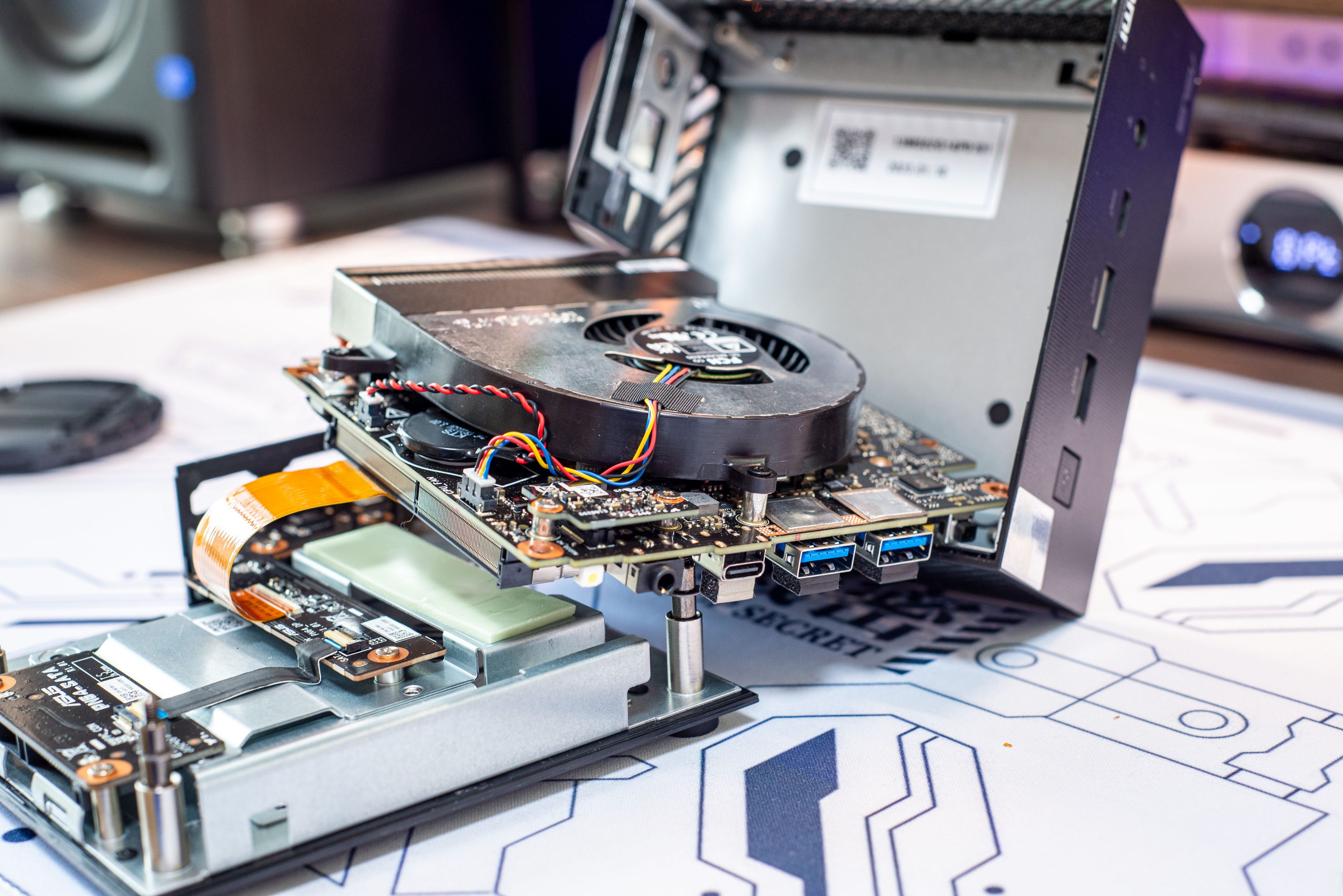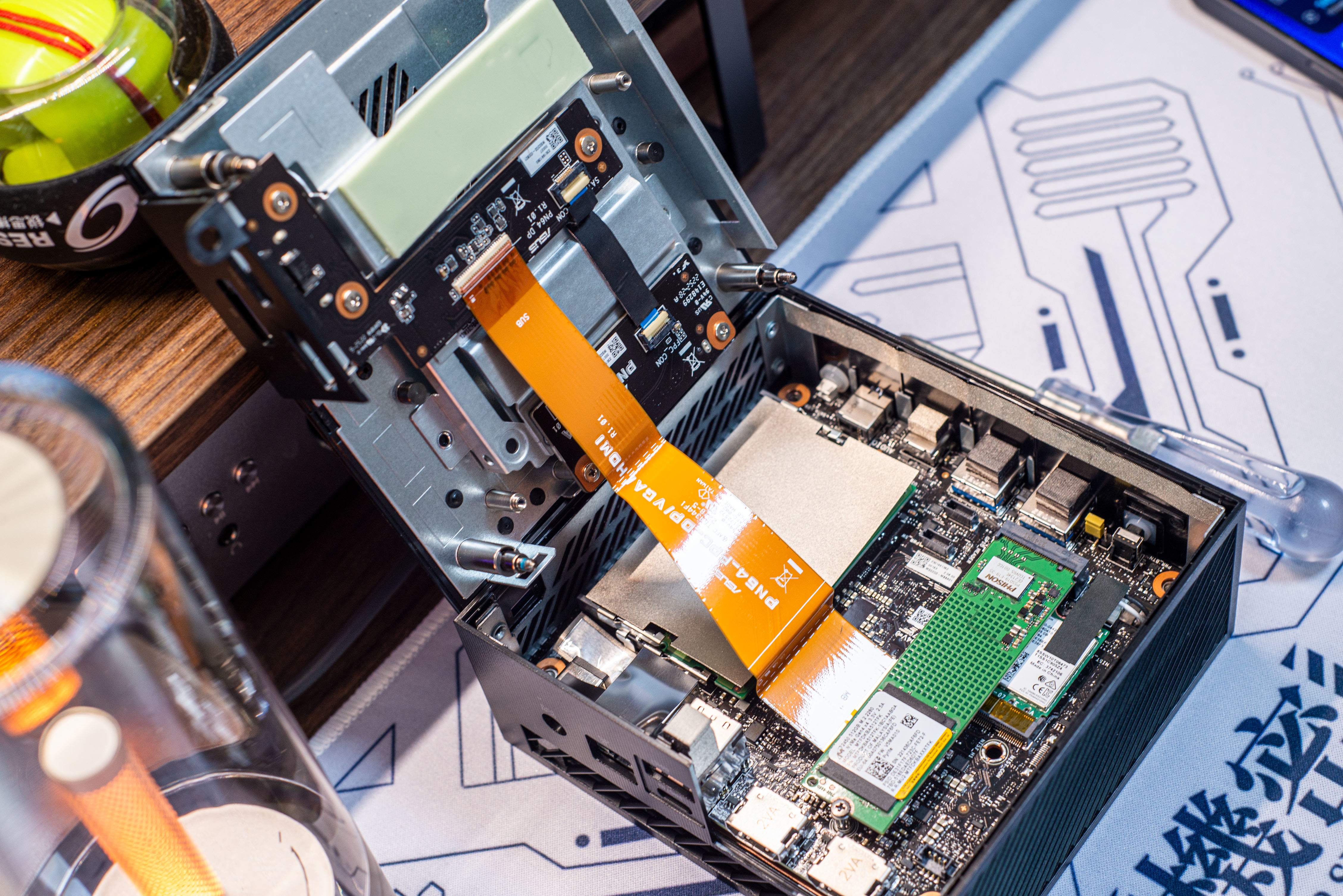 ▼内部布局是最考验迷你主机设计功力的,既要有优秀的散热效率,还要尽量保持内部空间硬件排列,以此达到将整体体积减小的目的。拧开底部脚垫上的螺丝,我们来一窥主机内部。