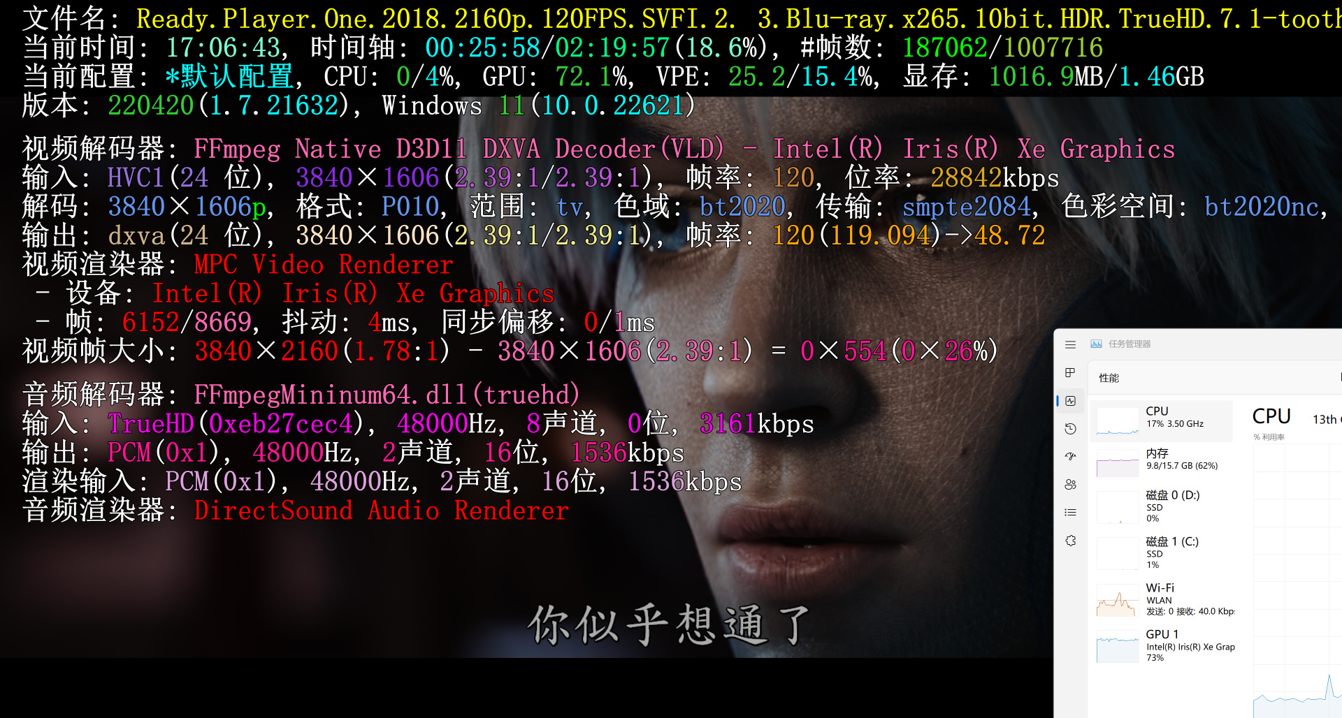 ▼要说破晓X 最适合的场景绝对是视频播放,4K@120fps@10bits 可以做到流畅播放,系统资源占用极低。