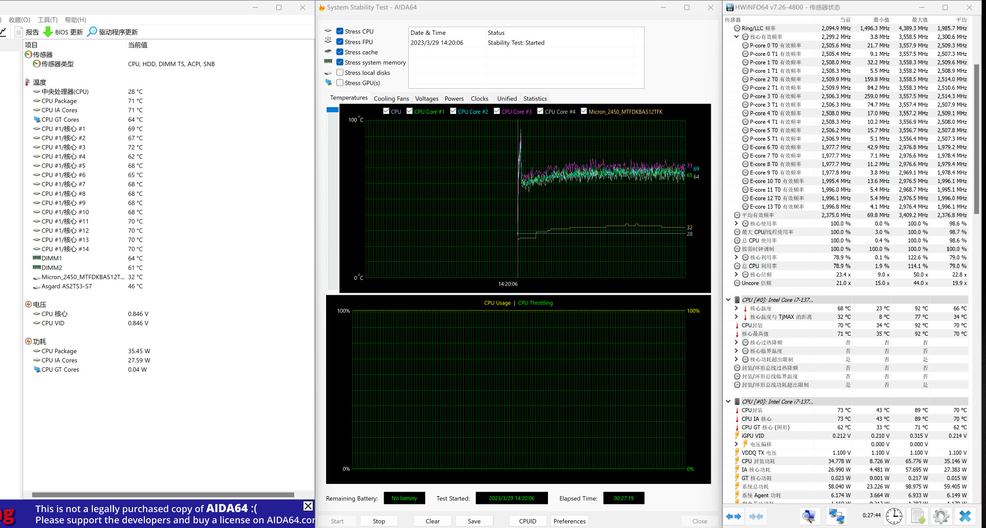 ▼看看整机的散热表现。环境温度 20°,运行27分钟双烤测试,性能核(P核)有效运行频率2.4Ghz,能效核(E核)有效平均频率1.99Ghz。有一说一,华硕的调教保守的简直过头了,好在换来了极致的静音和优秀的温度控制。是好是坏因人而异,对于大多数用户来说这个默认性能还是足够的。