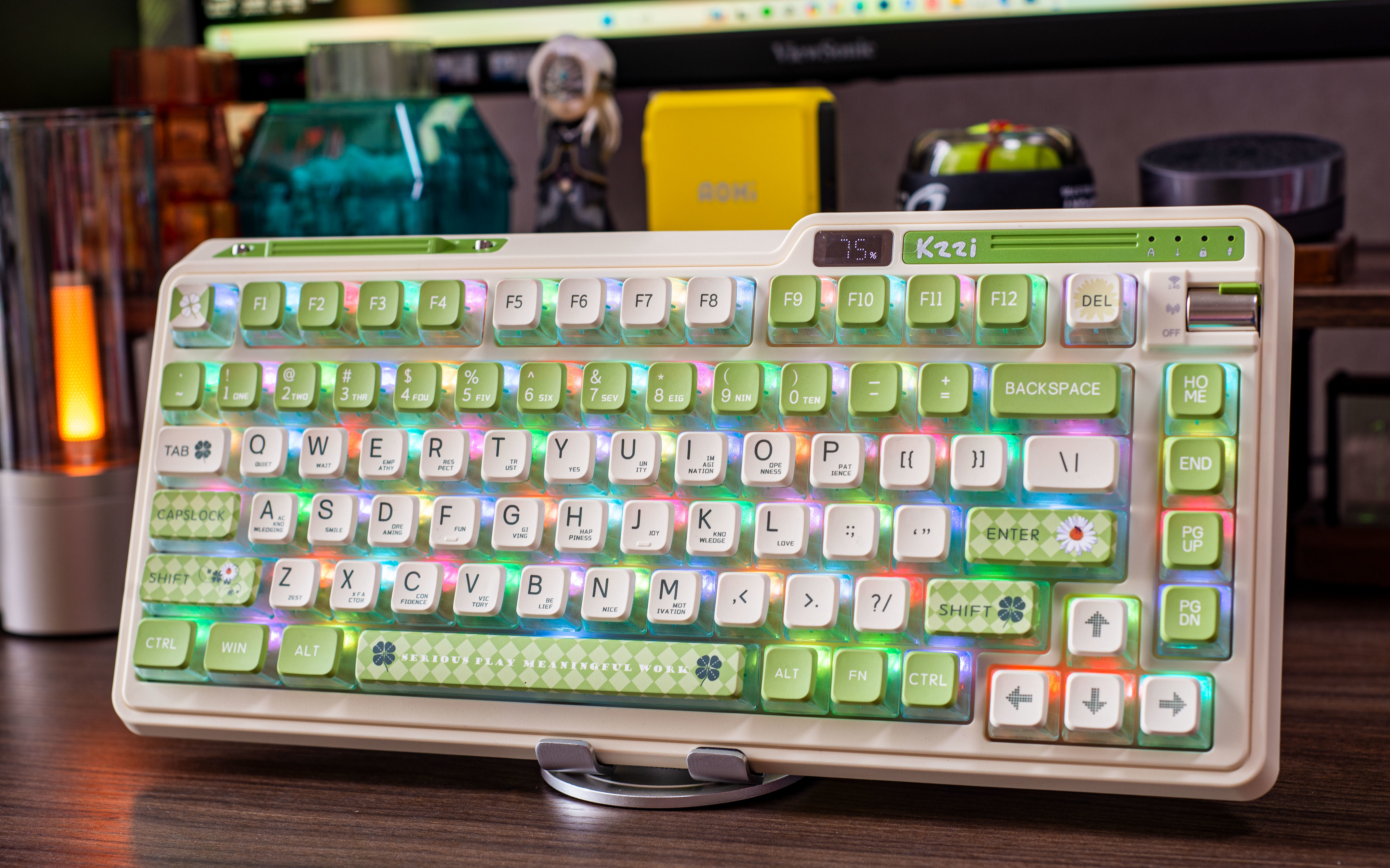 ▼搭配的键盘是珂芝K75,这也是近段时间爆火的75 配列机械键盘。不到 500 的价位,几乎涵盖了当下主流特性。三模无线连接、Gasket结构、旋钮式模式开关、电量显示屏、全键热插拔、特色轴体、RGB灯效,甚至还配送了块钢制定位板,可玩性还是比较足的。