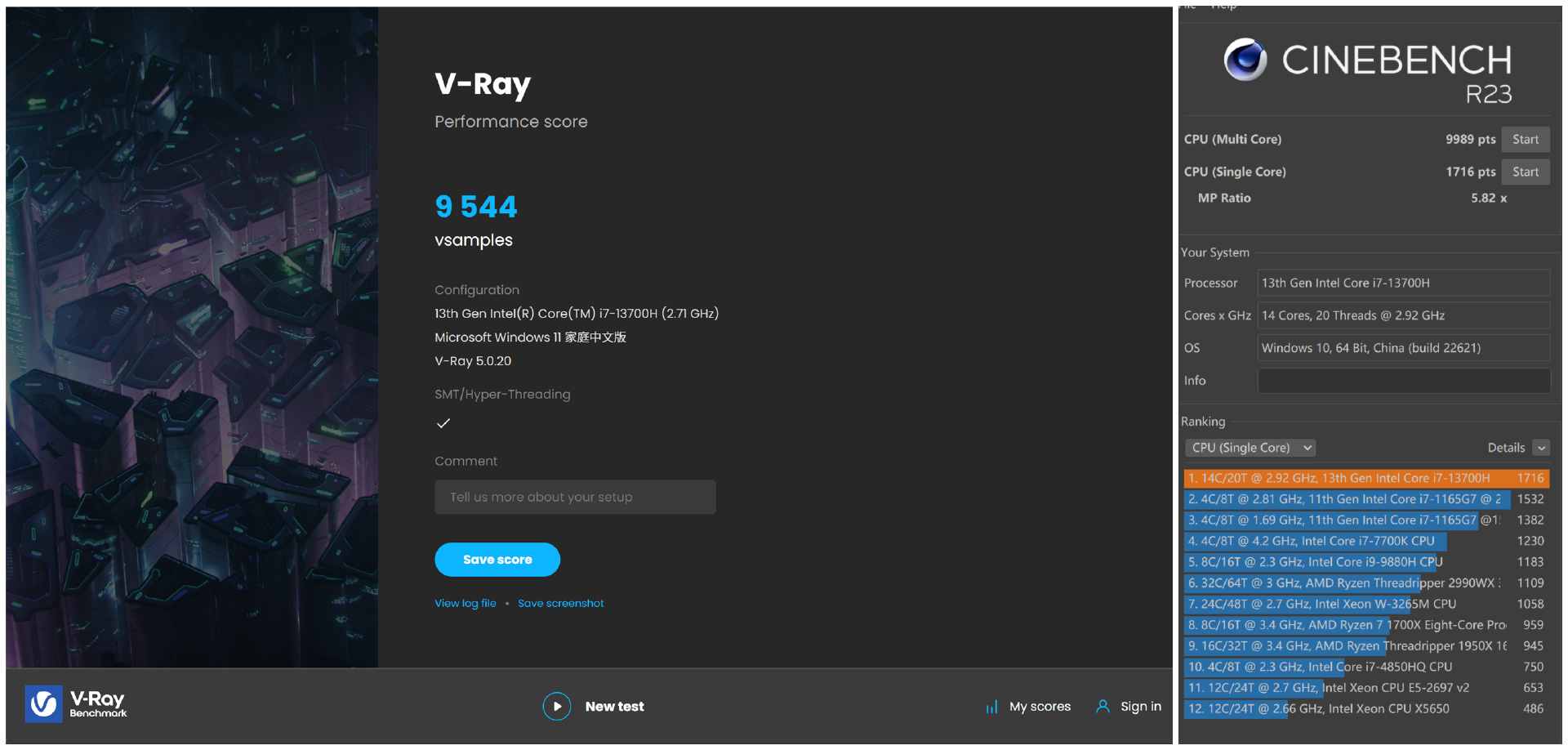 CineBenchR23:单核 1716pts,多核 9989pts。